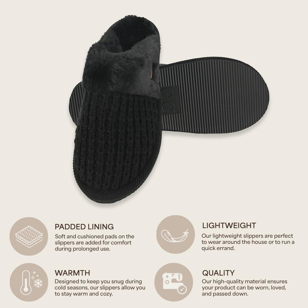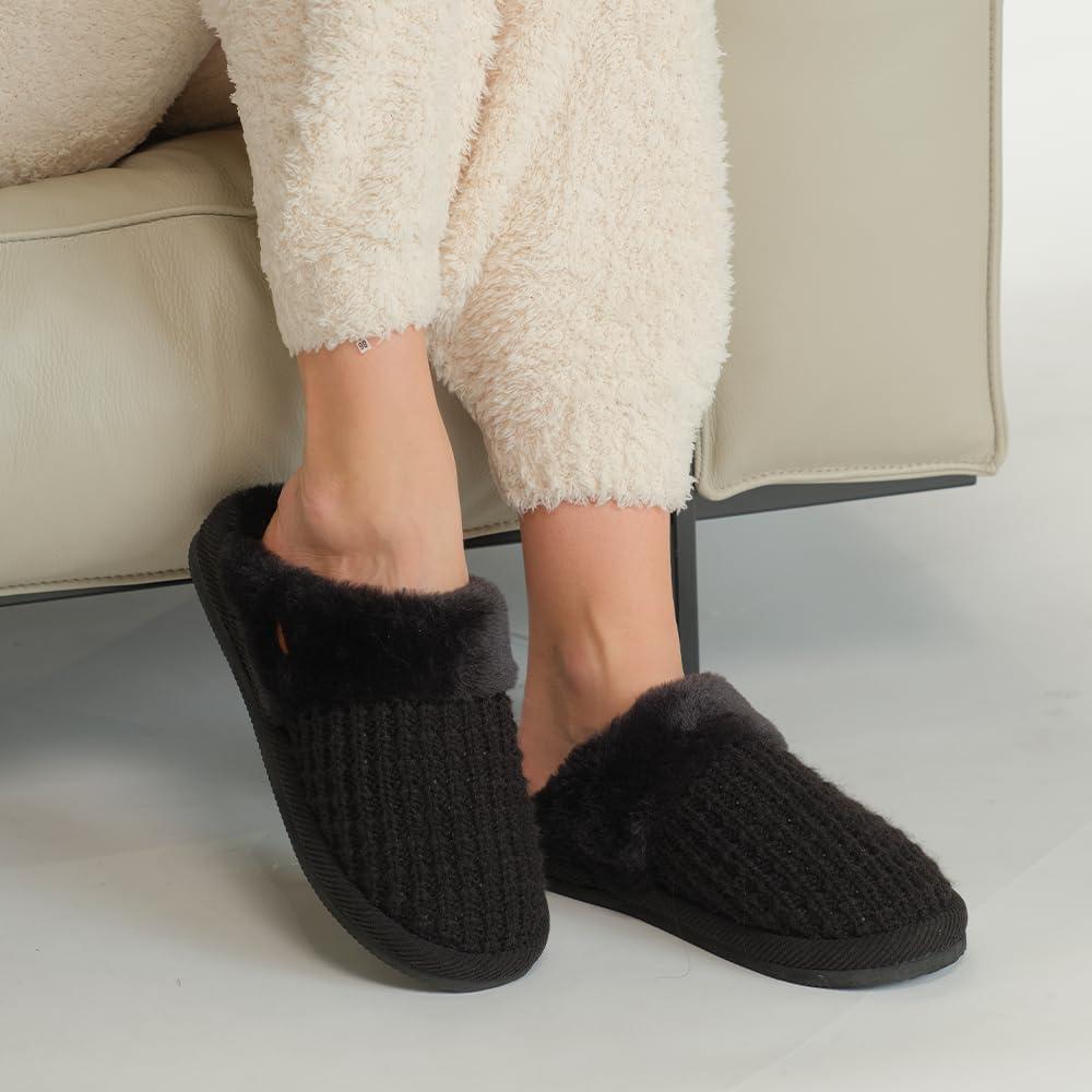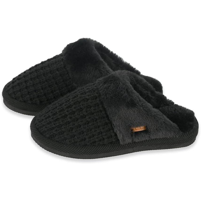 C.C Pattern Knitted Slip-On Slippers With Faux Fur Lining Indoor-Outdoor House For Women(Waffle Black)