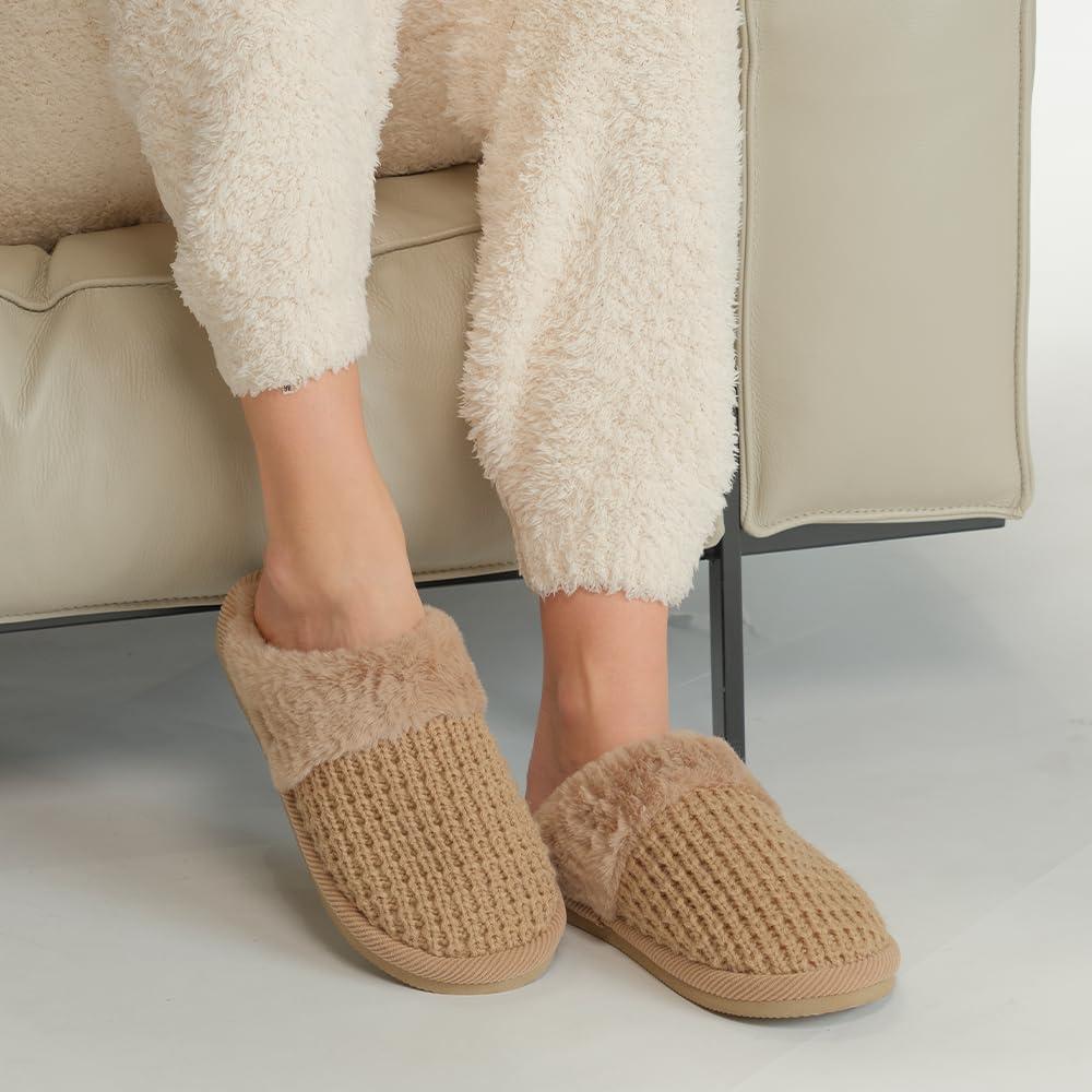 C.C Pattern Knitted Slip-On Slippers With Faux Fur Lining Indoor-Outdoor House For Women(Waffle Mocha)
