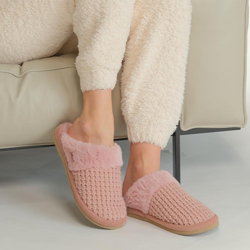 C.C Pattern Knitted Slip-On Slippers With Faux Fur Lining Indoor-Outdoor House For Women(Waffle Rose)