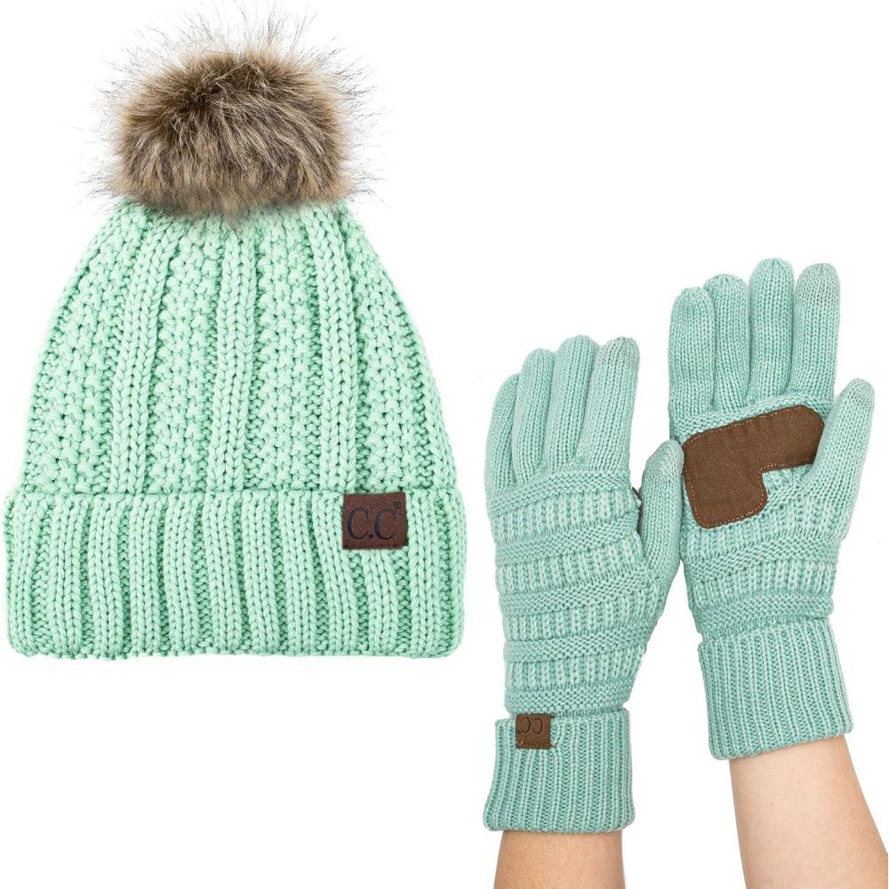 C.C Pom Cable Knit Beanie and Glove Set(Mint)