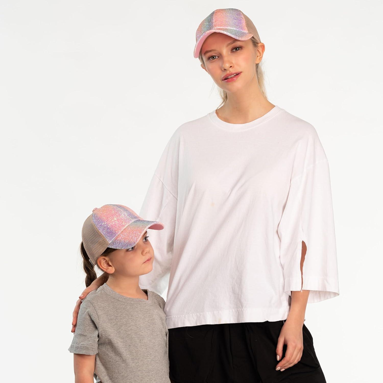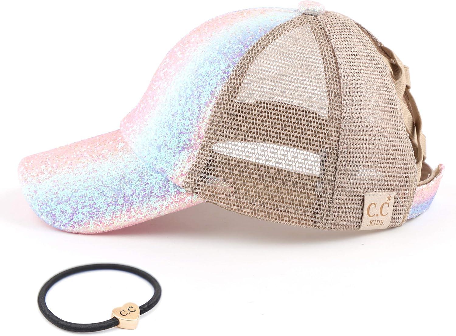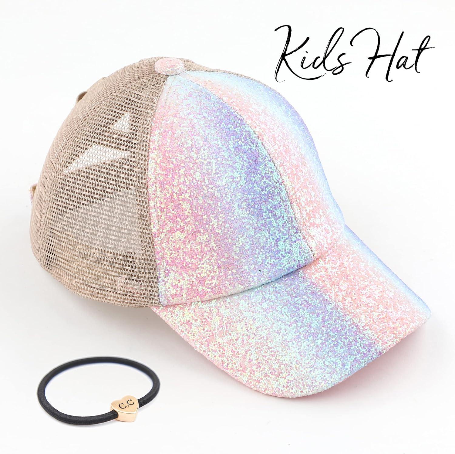 C.C Ponycap Messy High Bun Ponytail Adjustable Glitter Mesh Trucker Baseball Cap(A Elastic Band-crystal Ombre Unicon-kids)