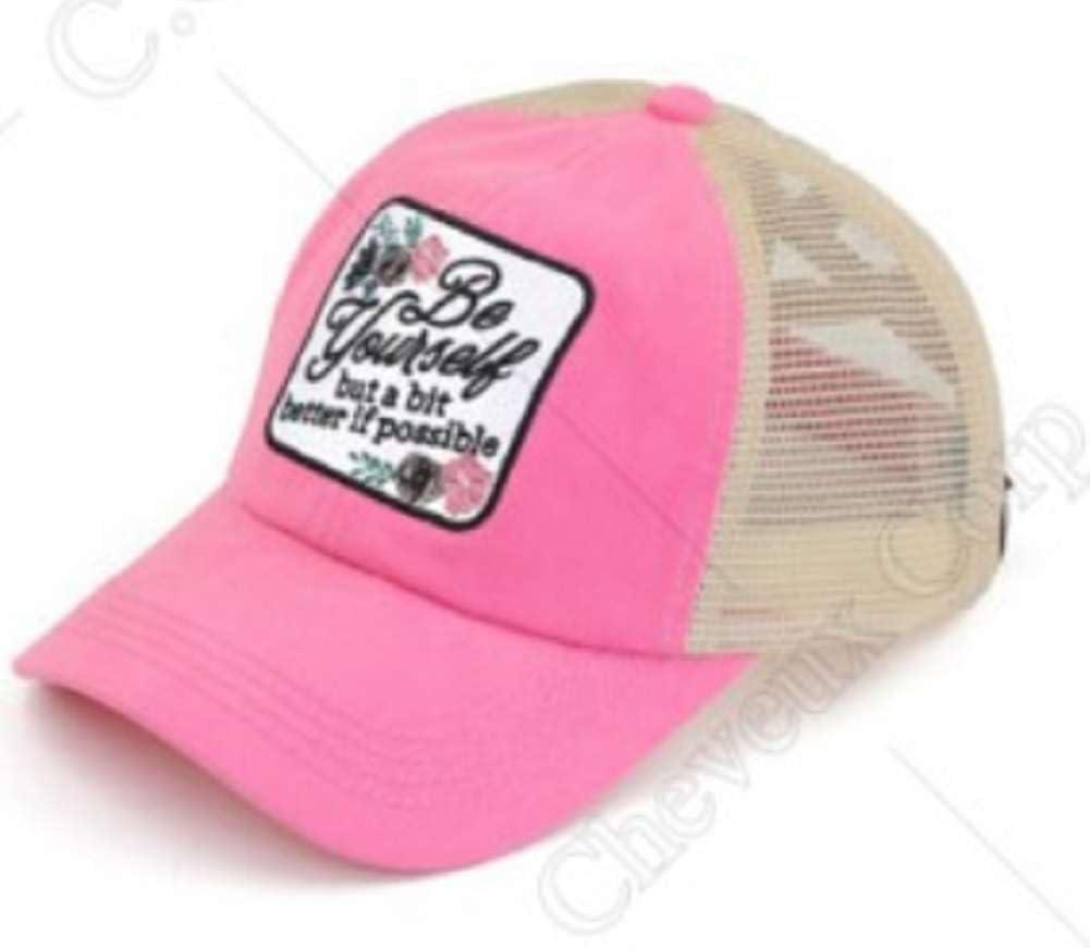 C.C Ponycap Messy High Bun Ponytail Adjustable Mesh Trucker Baseball Cap Hat(Criss Cross Patch Be Yourself Pink)