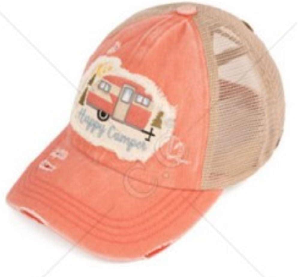 imageCC Ponycap Messy High Bun Ponytail Adjustable Mesh Trucker Baseball Cap HatCriss Cross Patch Happy Camper  Coral