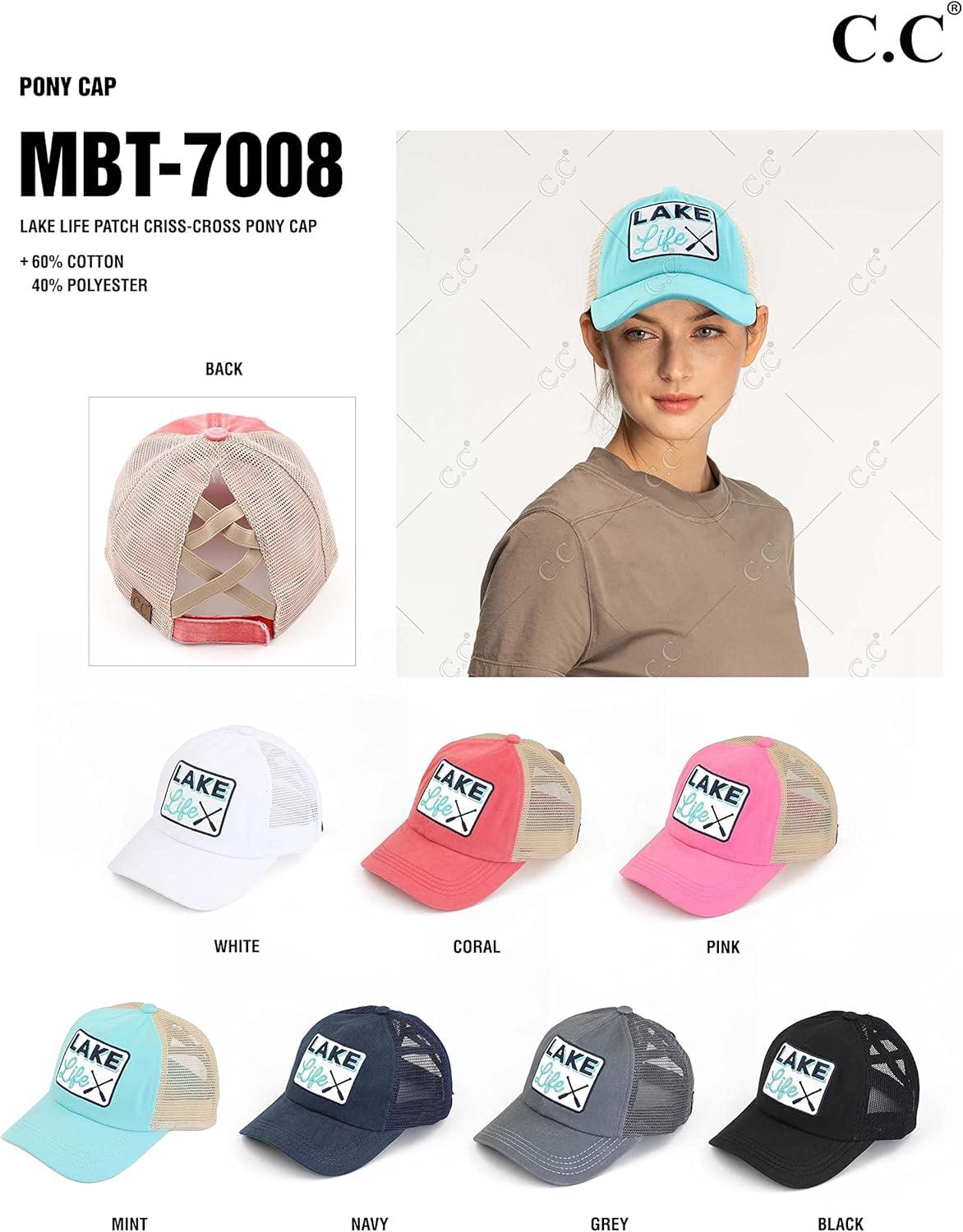 C.C Ponycap Messy High Bun Ponytail Adjustable Mesh Trucker Baseball Cap Hat(Criss Cross Patch Lake Life Pink)