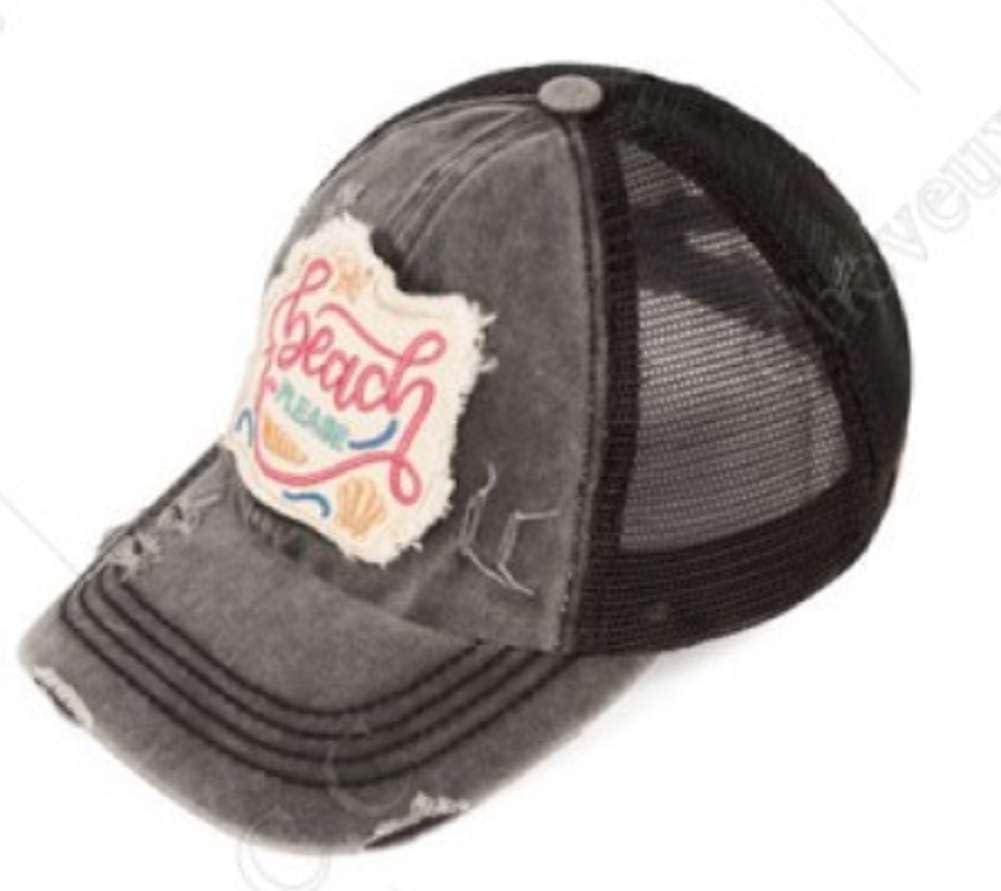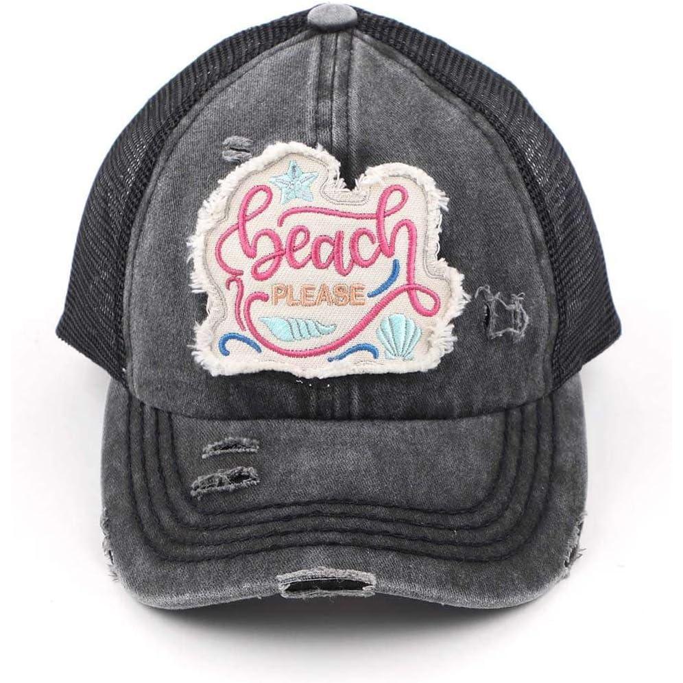 C.C Ponycap Messy High Bun Ponytail Adjustable Mesh Trucker Baseball Cap Hat(Distressed Beach Please Black)