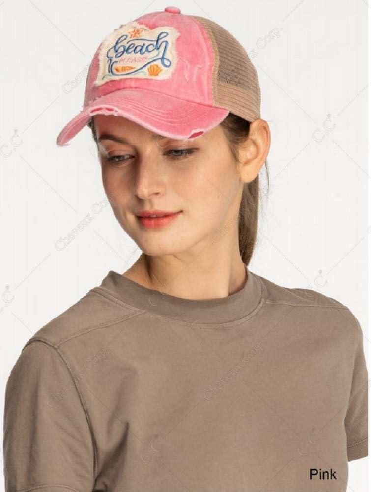 C.C Ponycap Messy High Bun Ponytail Adjustable Mesh Trucker Baseball Cap Hat(Distressed Beach Please Pink)