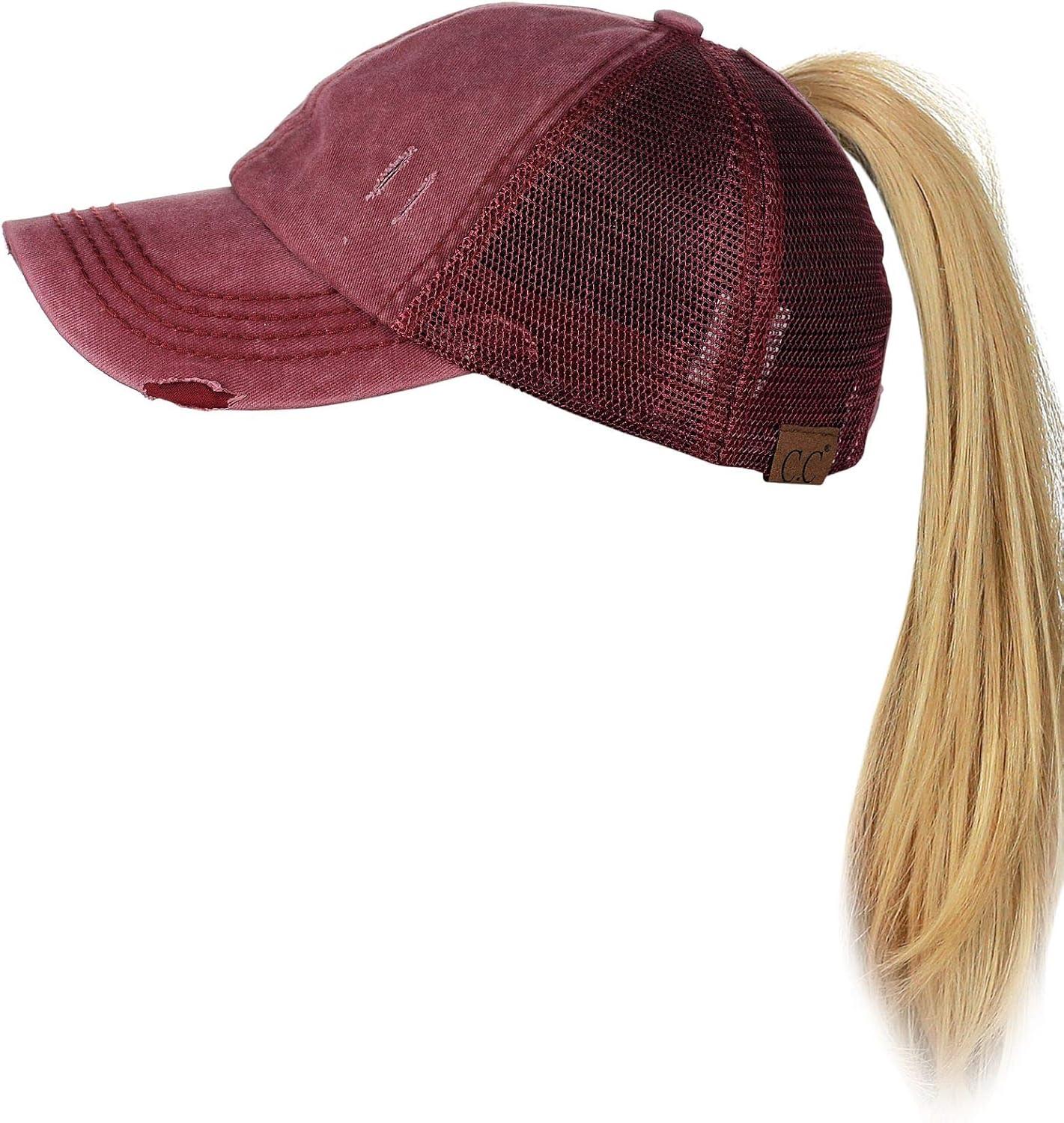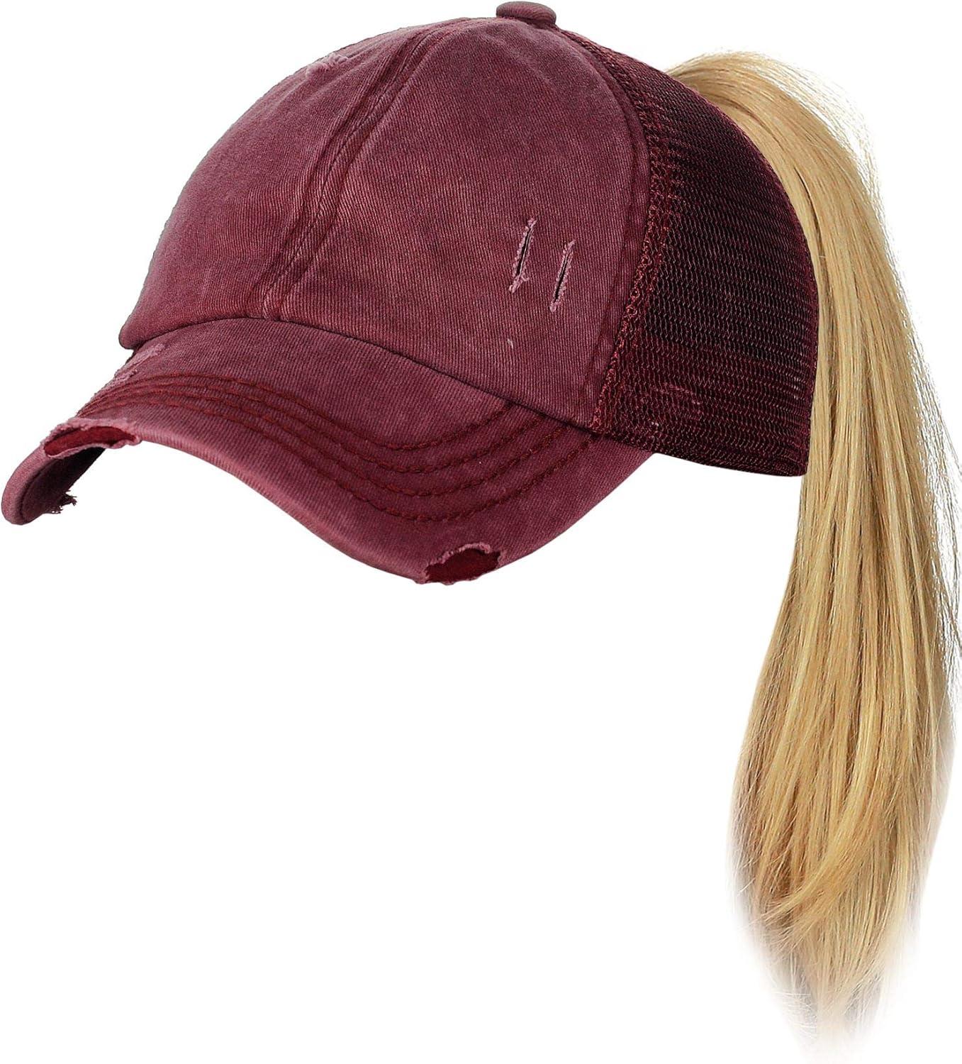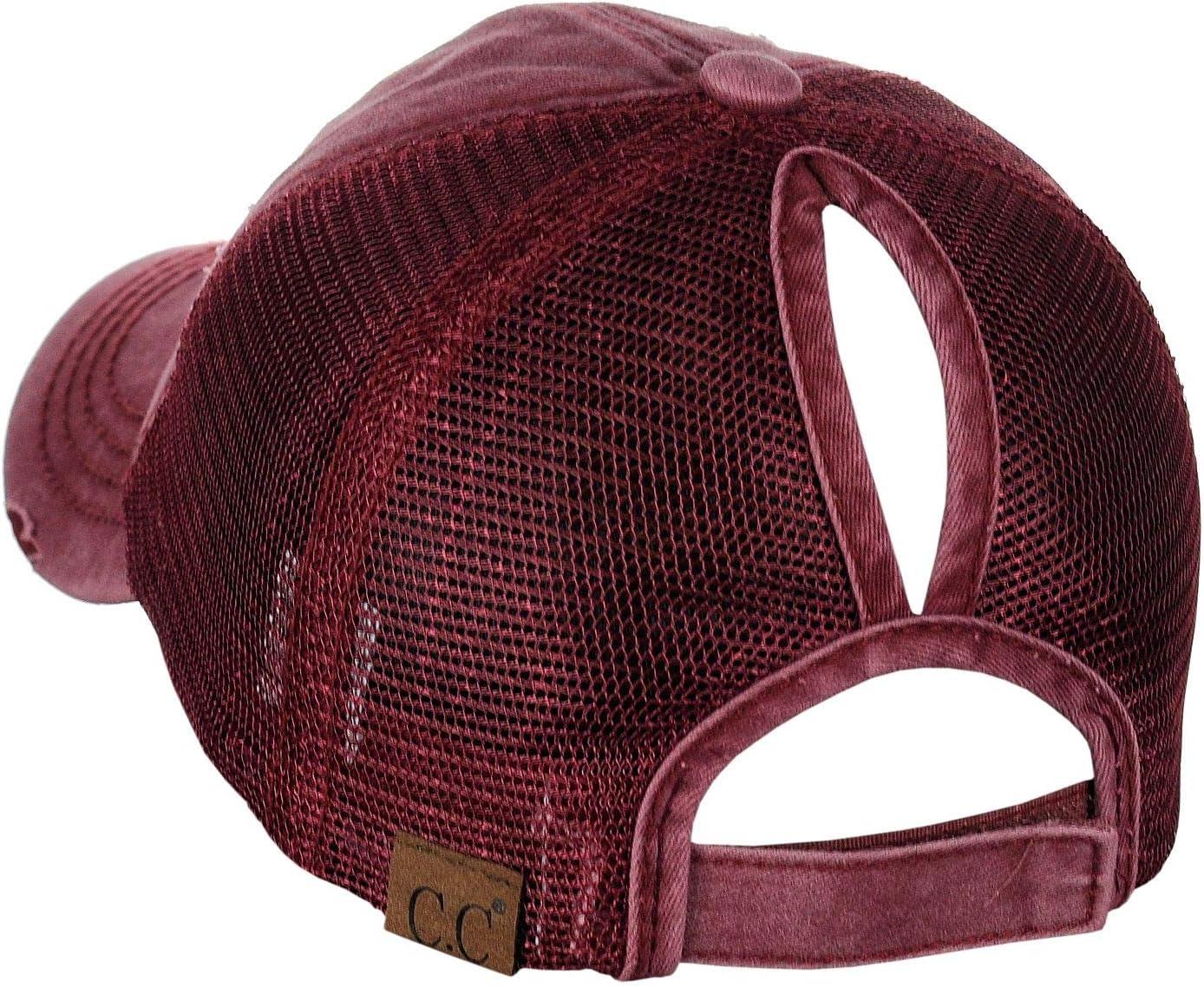 C.C Ponycap Messy High Bun Ponytail Adjustable Mesh Trucker Baseball Cap Hat(Distressed Burgundy)