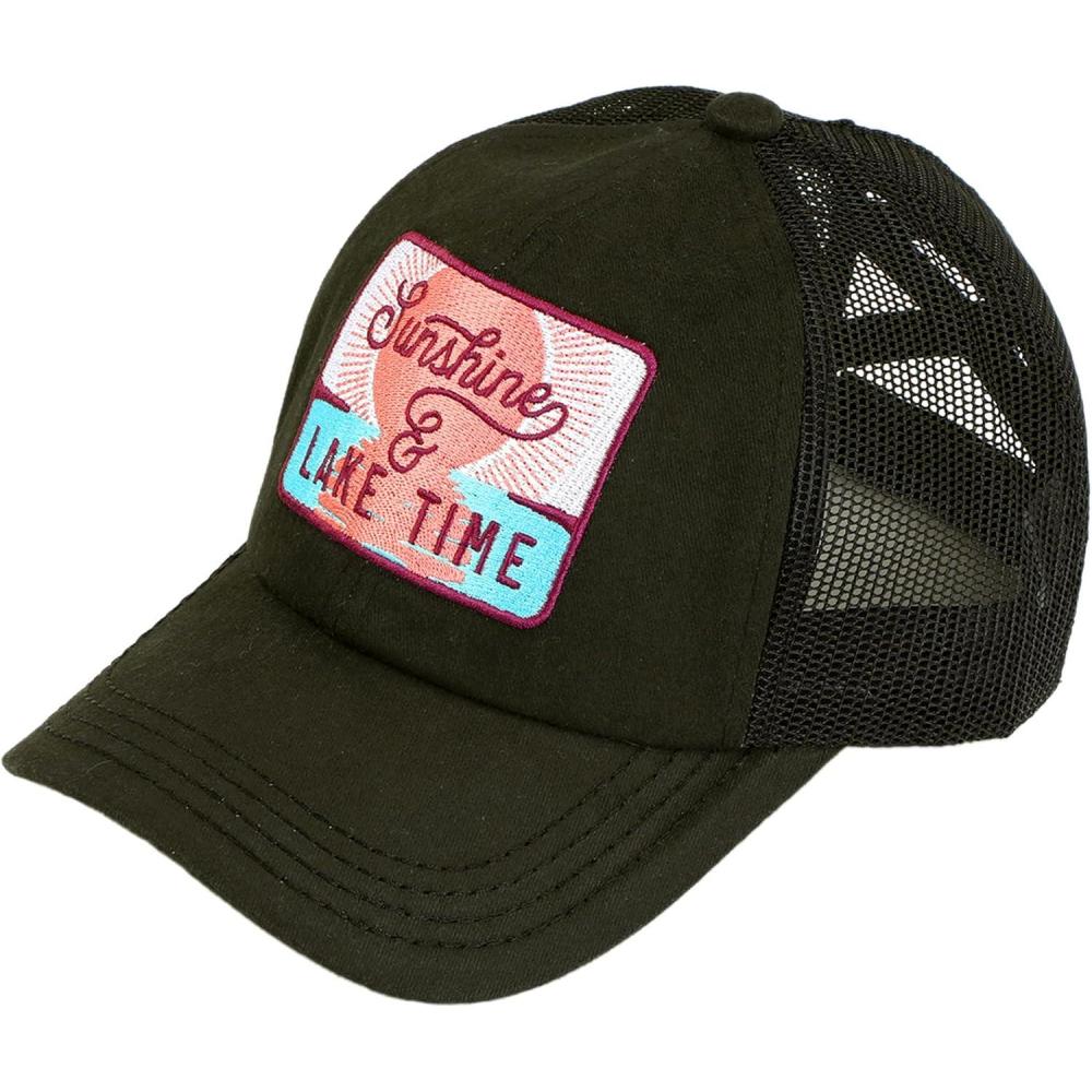 C.C Ponycap Messy High Bun Ponytail Adjustable Mesh Trucker Baseball Cap Hat(Patch Hello Sunshine and Lake Time Black)
