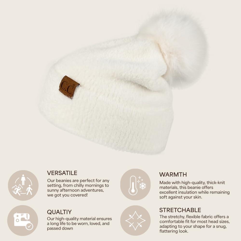 C.C Sequin Pom Beanie for Women – Acrylic Stretchable Soft Warm Knit Winter Skully Hat with Yarn Pom(Terry-ivory)