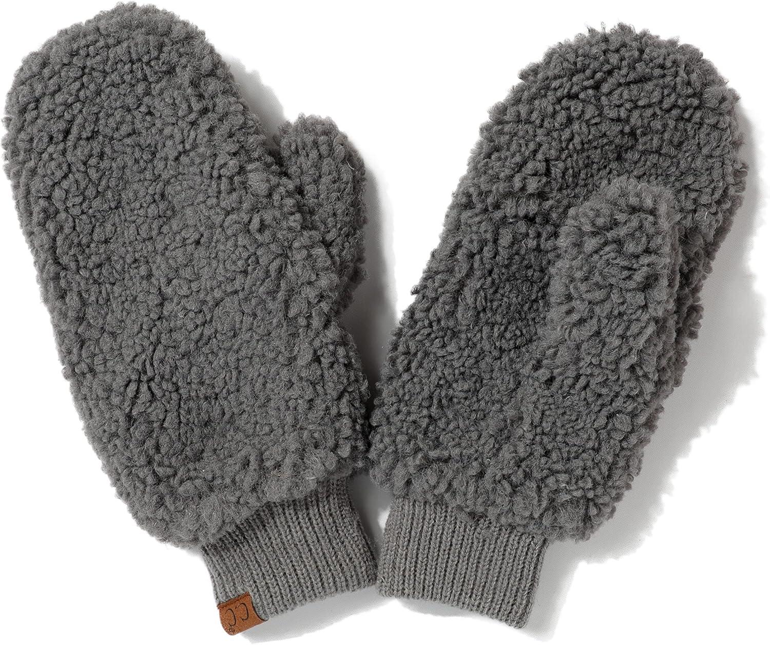 C.C Sherpa Cuff Beanie Hat Suede Logo and Sherpa Mitten Gloves (HAT-008,MT-008)(Grey-gift Set)