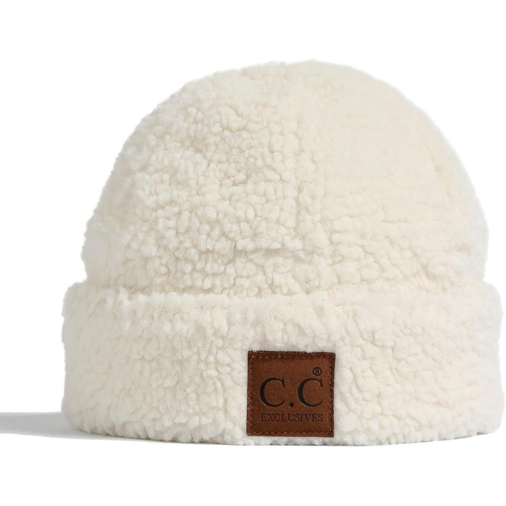 C.C Sherpa Cuff Beanie Hat Suede Logo and Sherpa Mitten Gloves (HAT-008,MT-008)(Ivory-beanie)