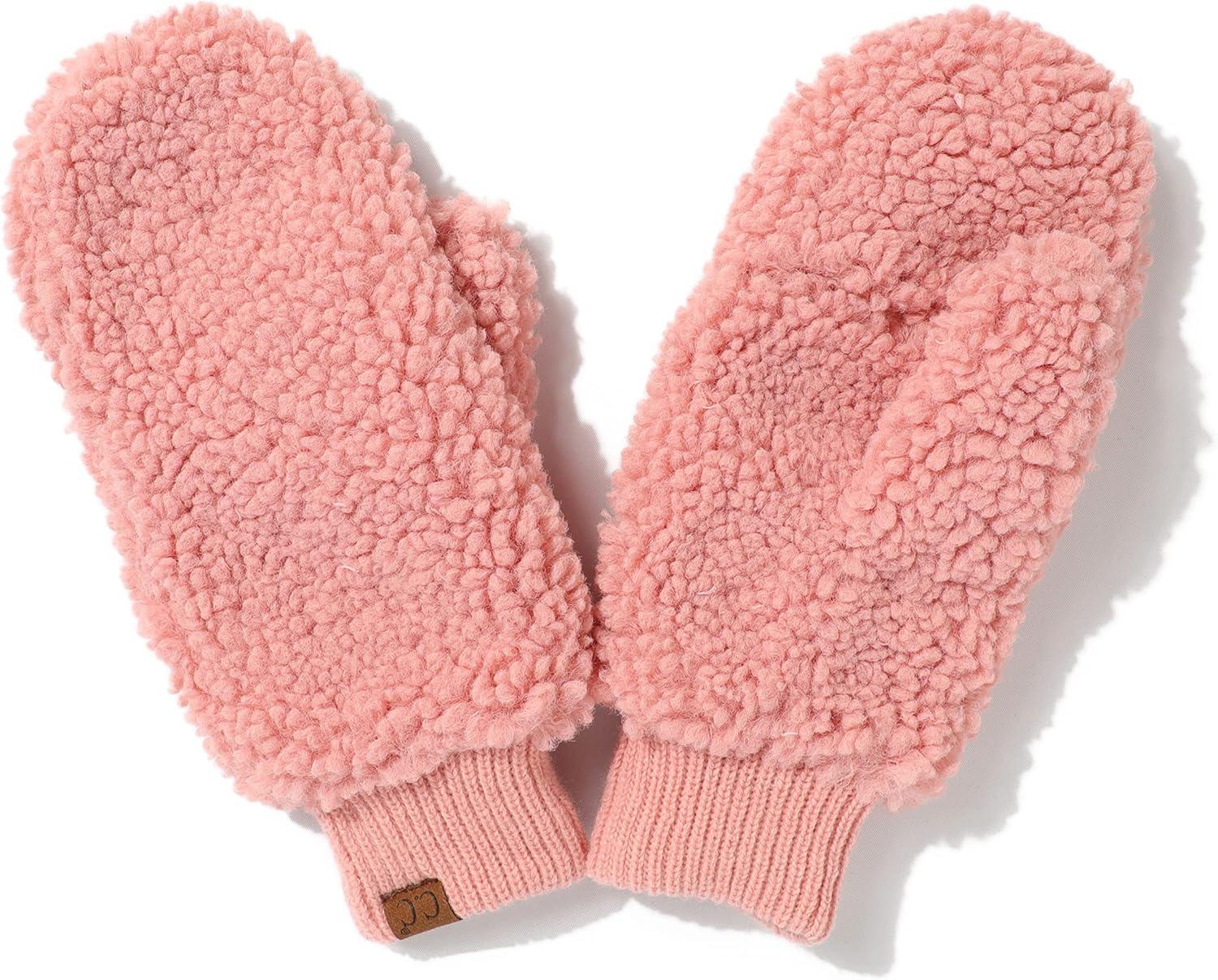 C.C Sherpa Cuff Beanie Hat Suede Logo and Sherpa Mitten Gloves (HAT-008,MT-008)(Rose-gift Set)