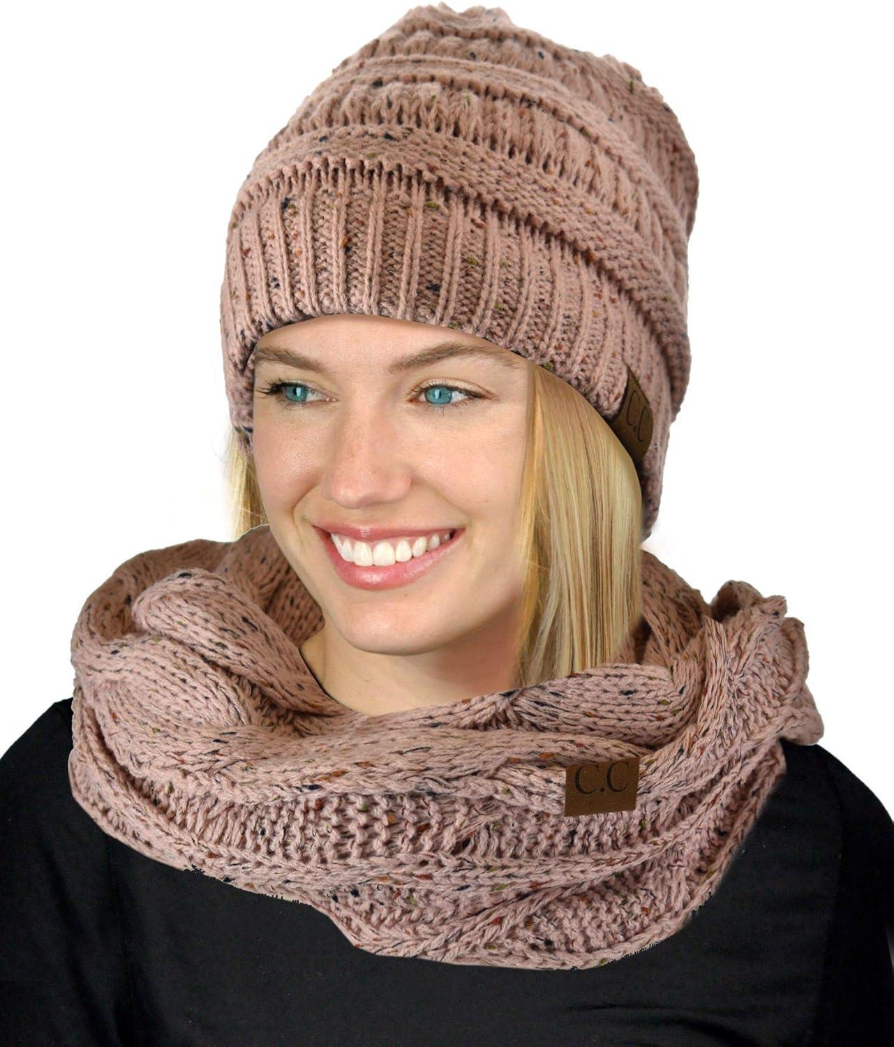 C.C Soft Stretch Colorful Confetti Cable Knit Beanie and Infinity Loop Scarf Set(Indi Pink)