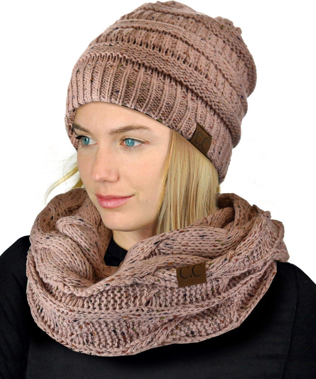 C.C Soft Stretch Colorful Confetti Cable Knit Beanie and Infinity Loop Scarf Set(Dark Olive)