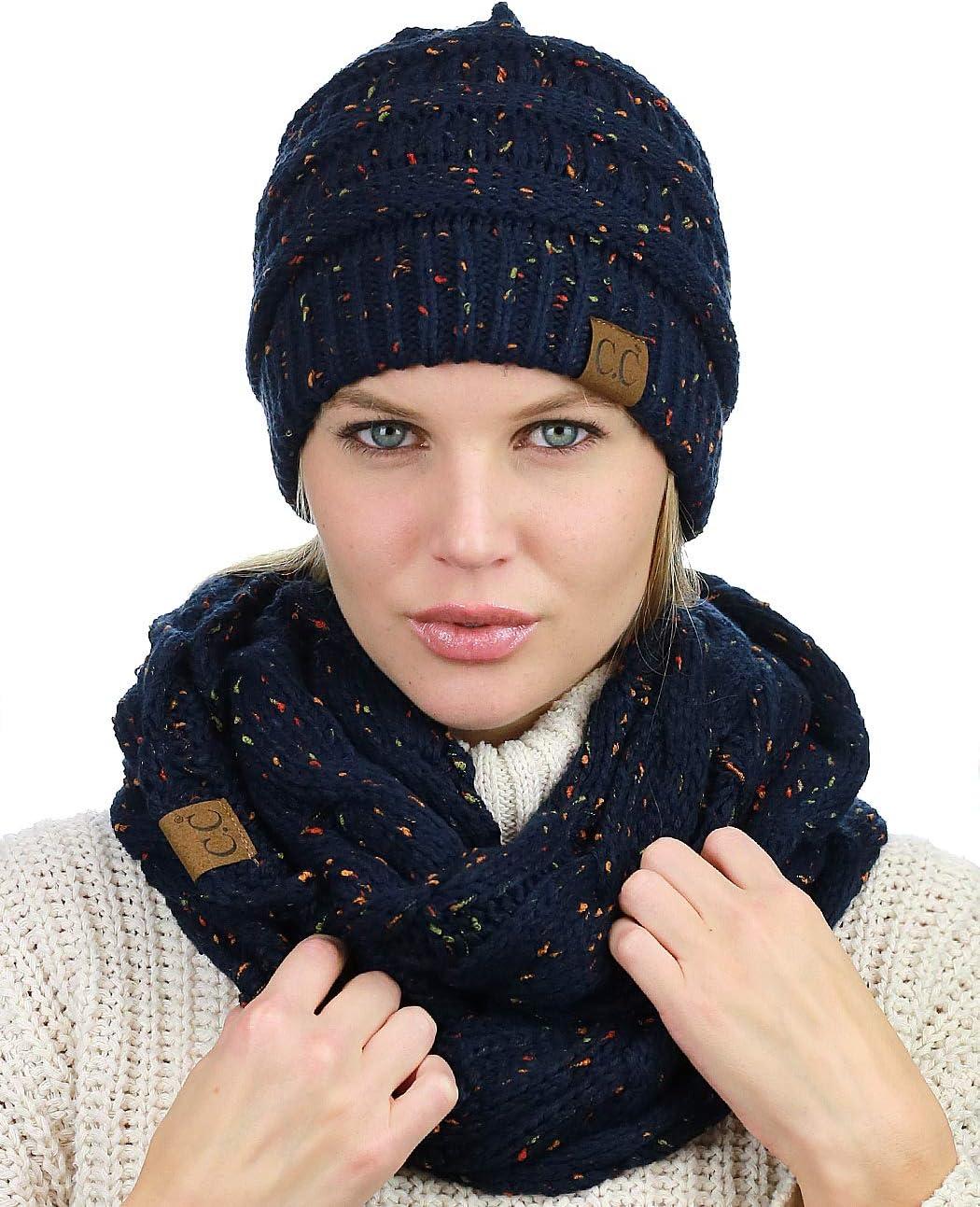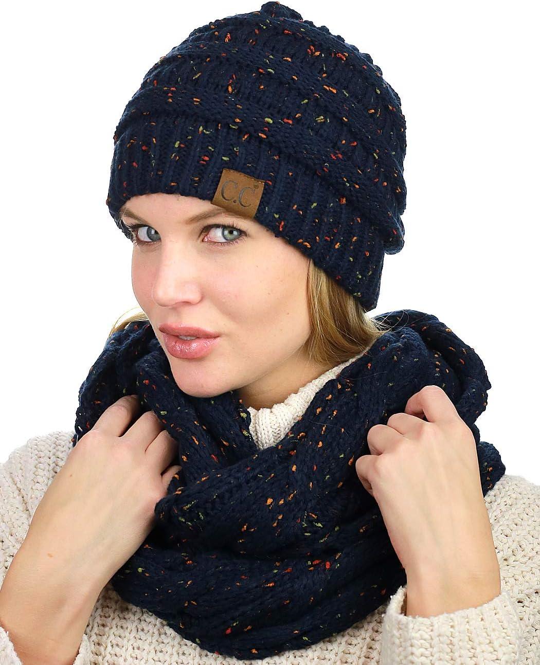 C.C Soft Stretch Colorful Confetti Cable Knit Beanie and Infinity Loop Scarf Set(Navy)