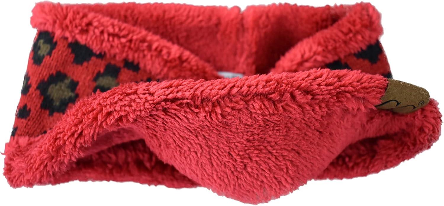 C.C Soft Stretch Winter Warm Cable Knit Fuzzy Lined Ear Warmer Headband(Leopard Red)