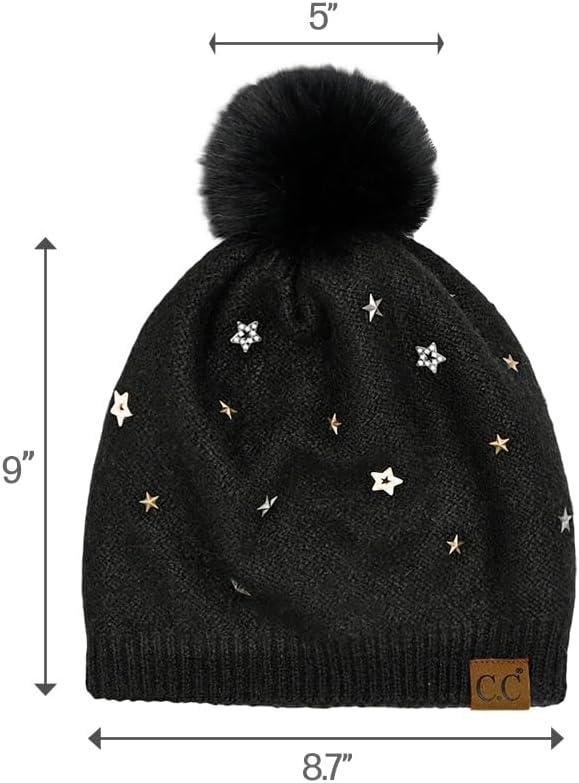 C.C Star Stud Fur Pom Beanie for Women - Recycled Yarn Stretchable Soft Warm Knit Winter Skully Hat with Faux Fur Pom(Star Stud-black)