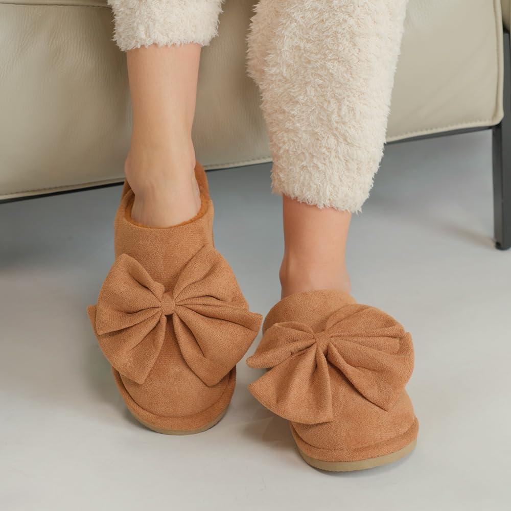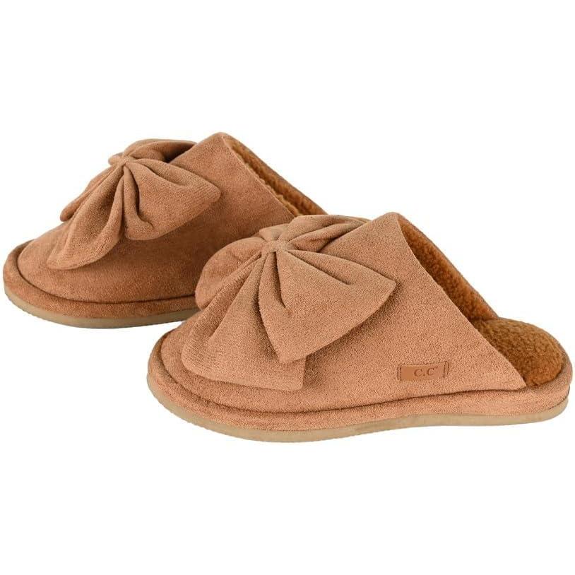 C.C Suede Faux Fur Lined House Indoor-Outdoor Slippers Slip-On for Women(Bow Camel)
