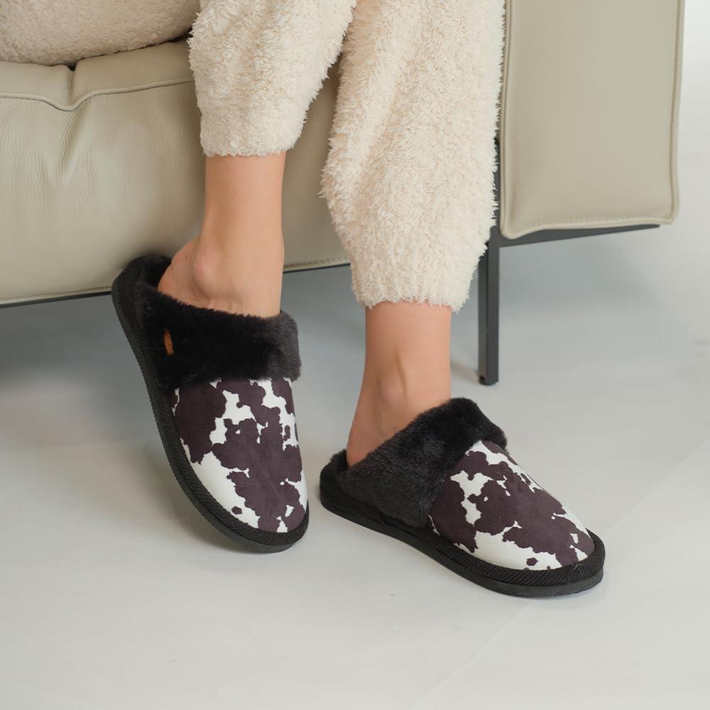 C.C Suede Faux Fur Lined House Indoor-Outdoor Slippers Slip-On for Women(Cow Print Black)