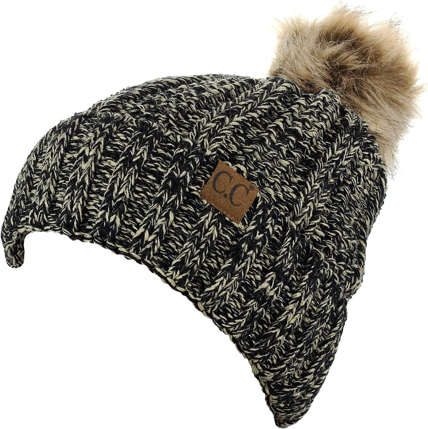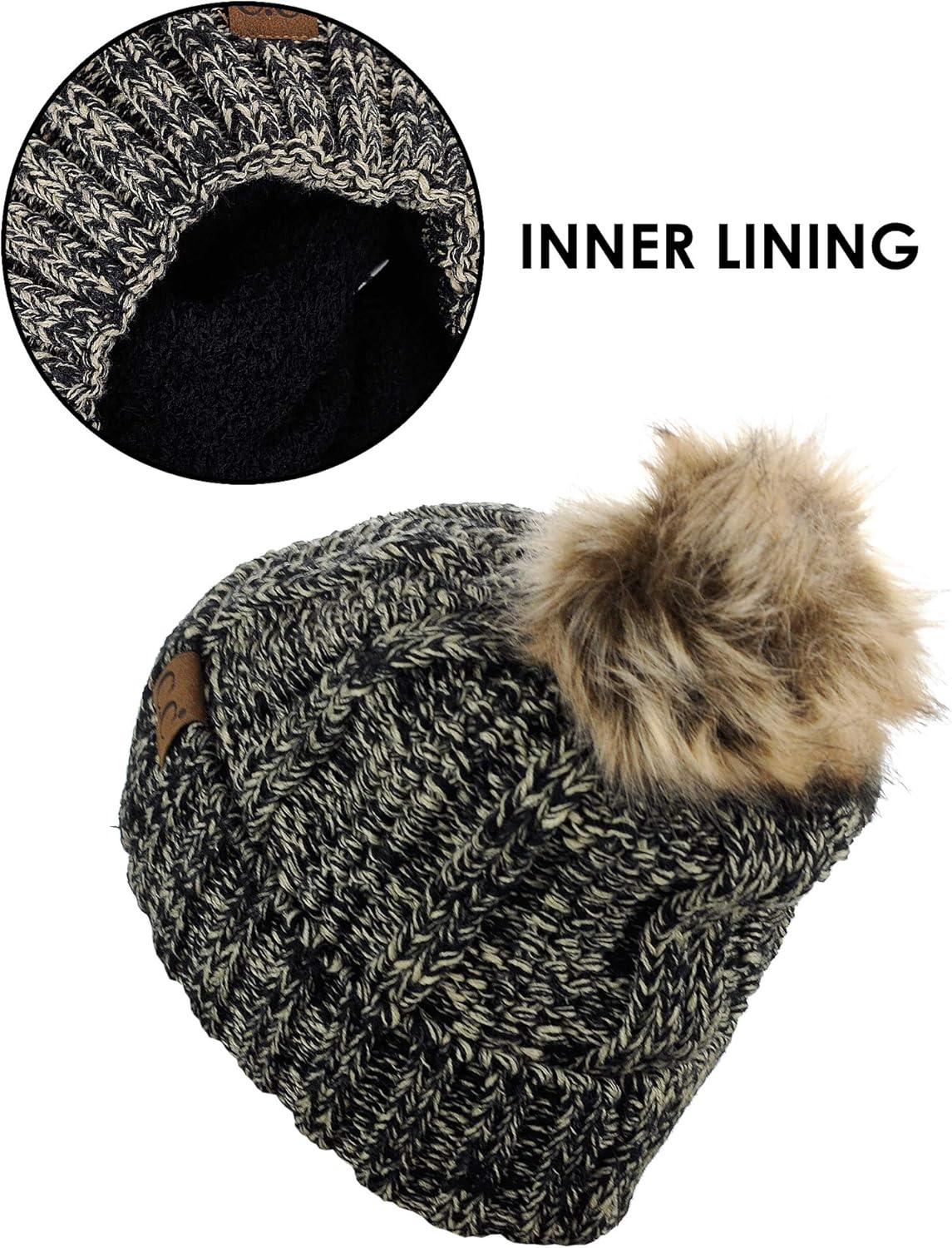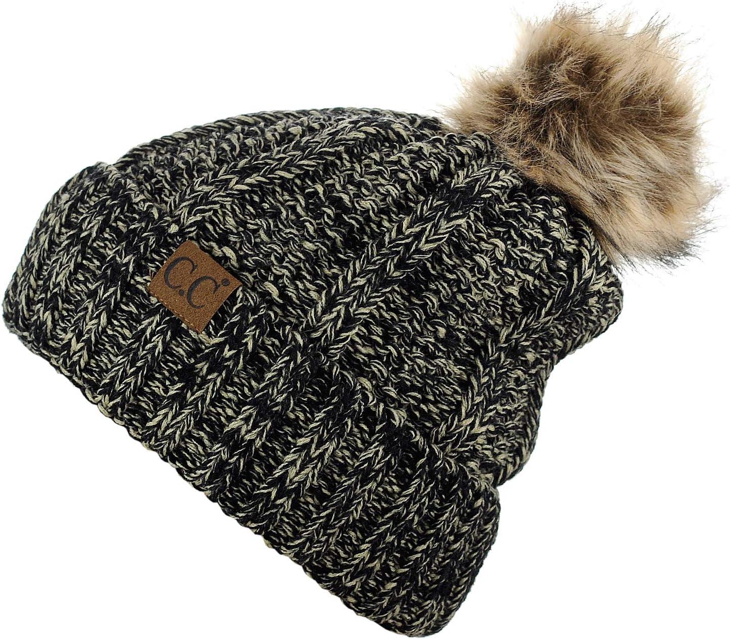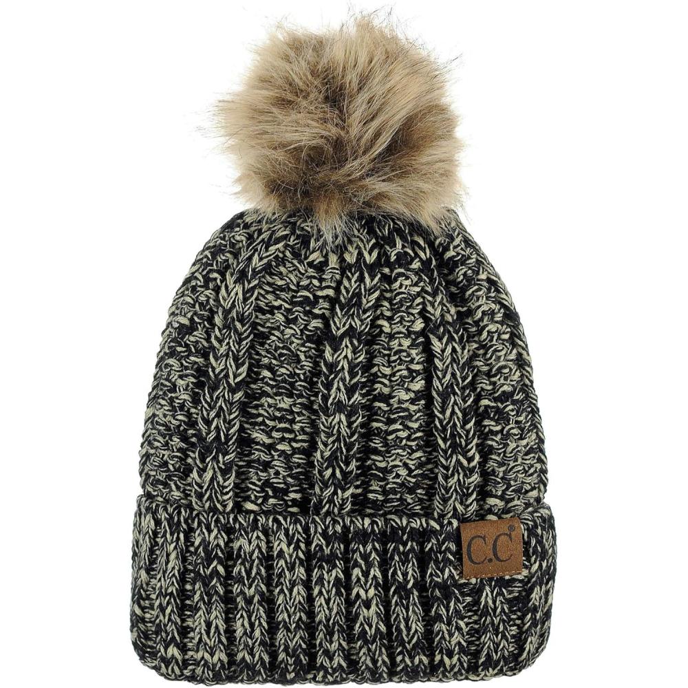 C.C Thick Cable Knit Faux Fuzzy Fur Pom Fleece Lined Skull Cap Cuff Beanie(2 Tone Black/Dark Beige)