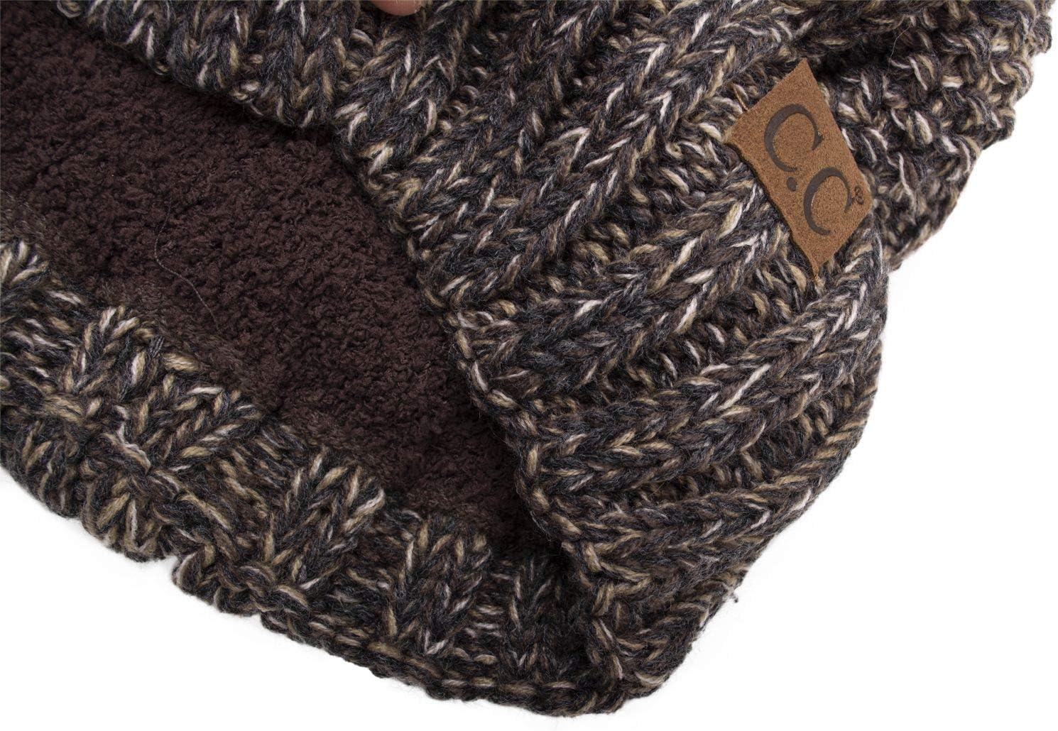 C.C Thick Cable Knit Faux Fuzzy Fur Pom Fleece Lined Skull Cap Cuff Beanie(3 Tone Brown)