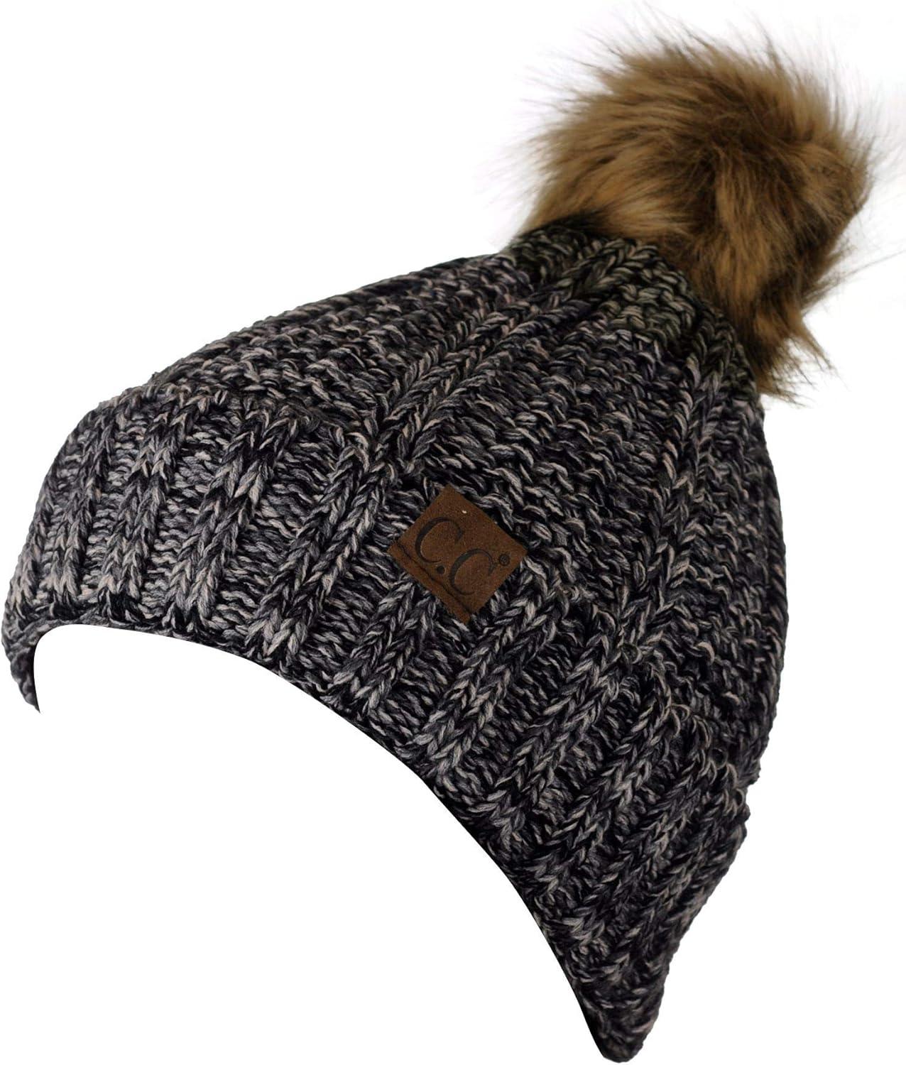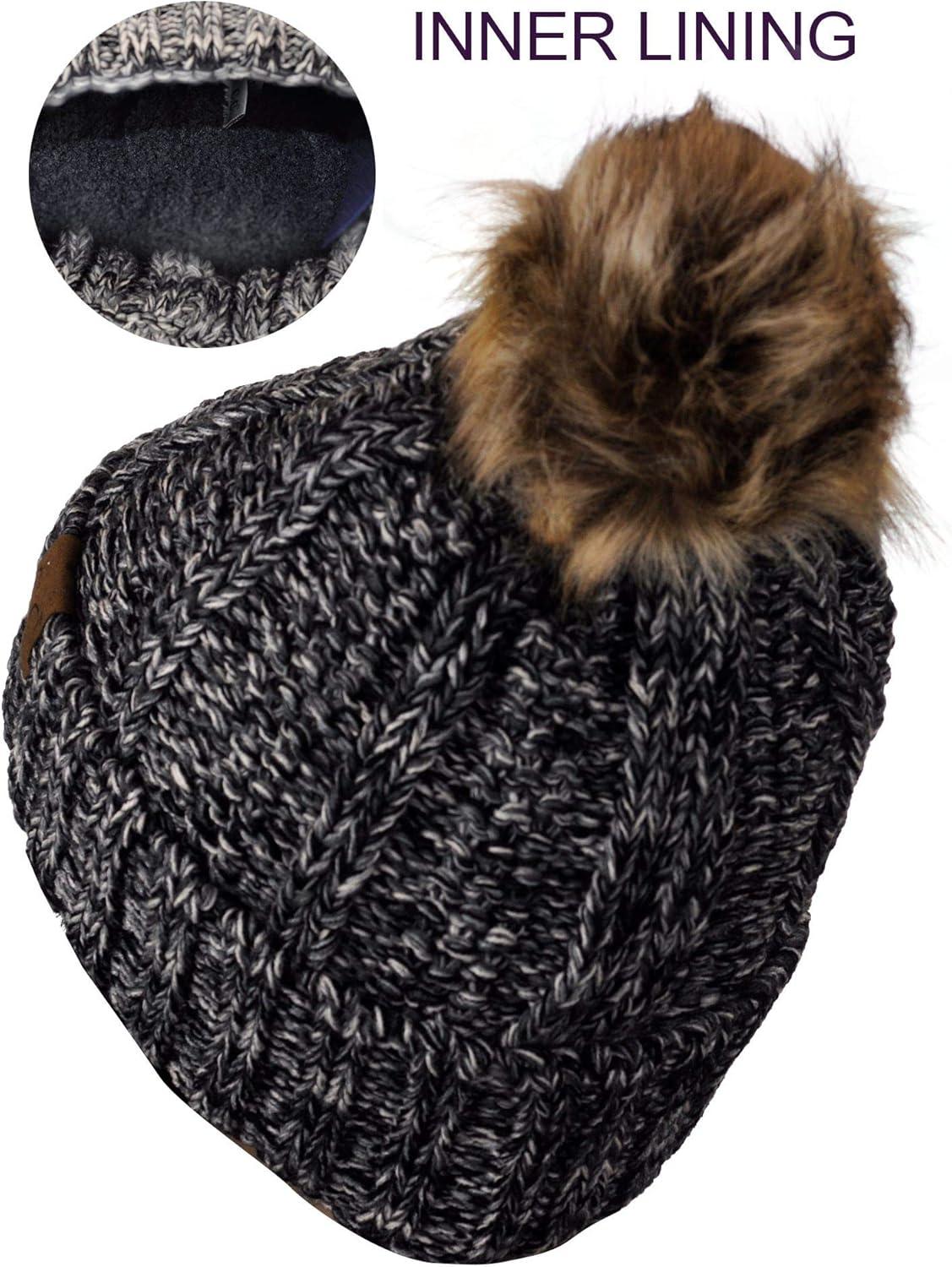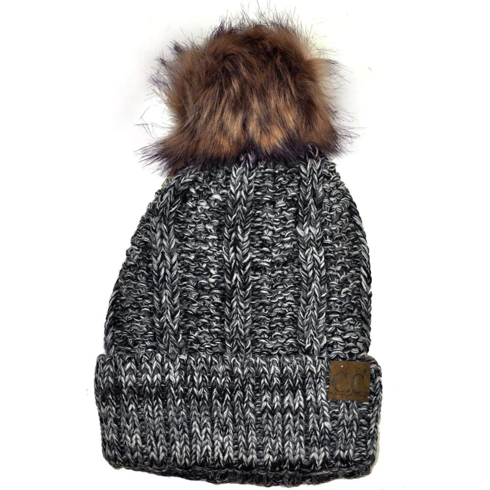 imageCC Thick Cable Knit Faux Fuzzy Fur Pom Fleece Lined Skull Cap Cuff Beanie3 Tone Brown