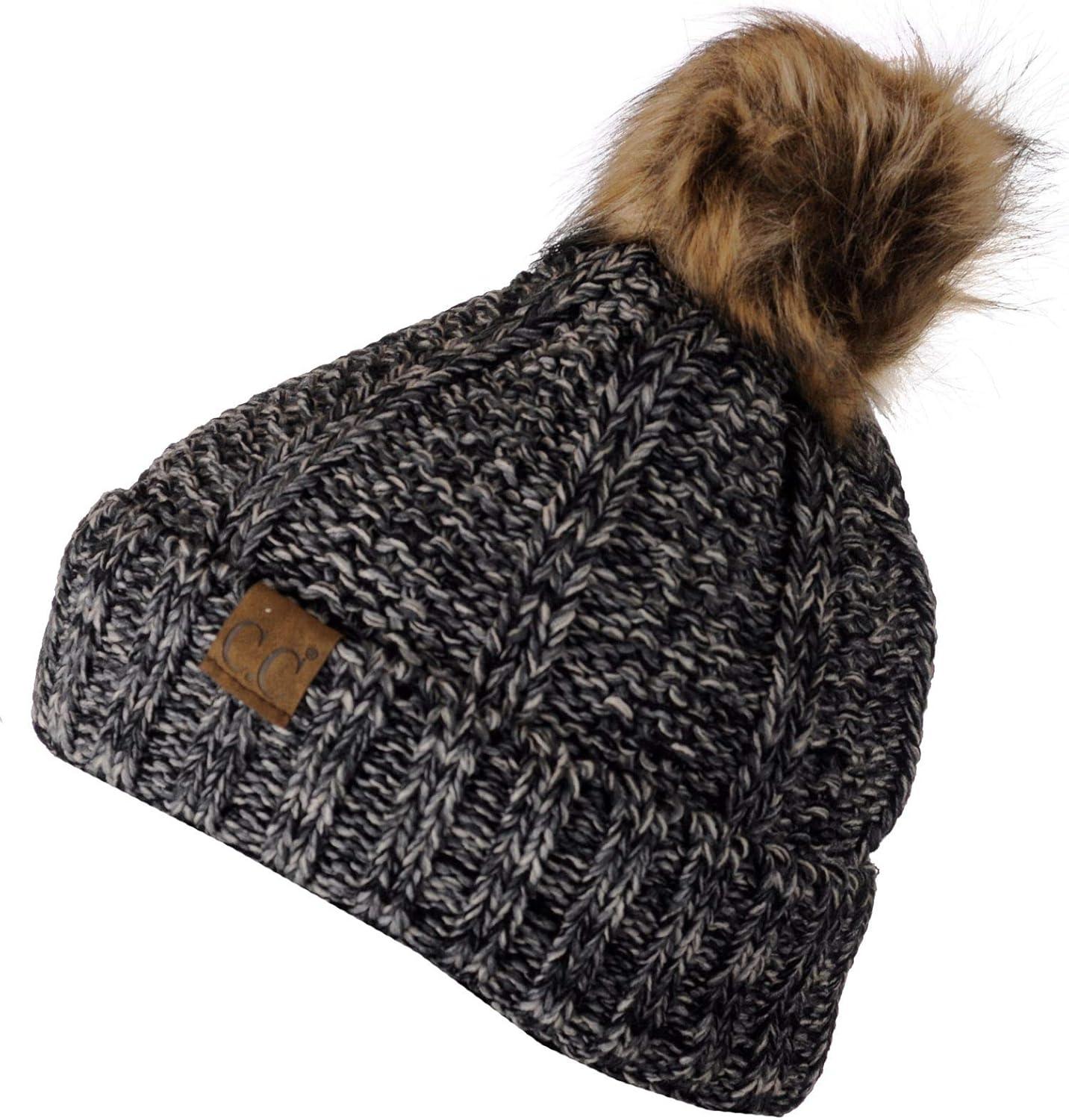 C.C Thick Cable Knit Faux Fuzzy Fur Pom Fleece Lined Skull Cap Cuff Beanie(3 Tone Brown)