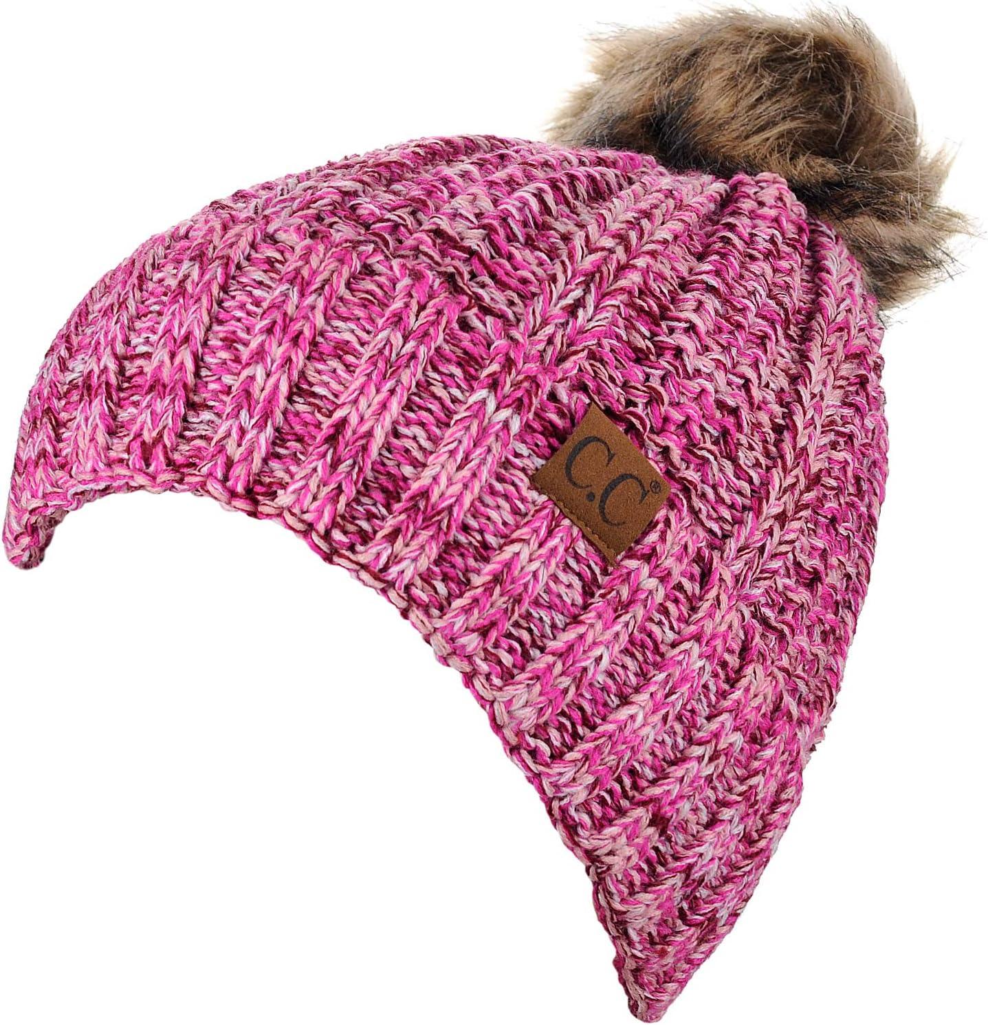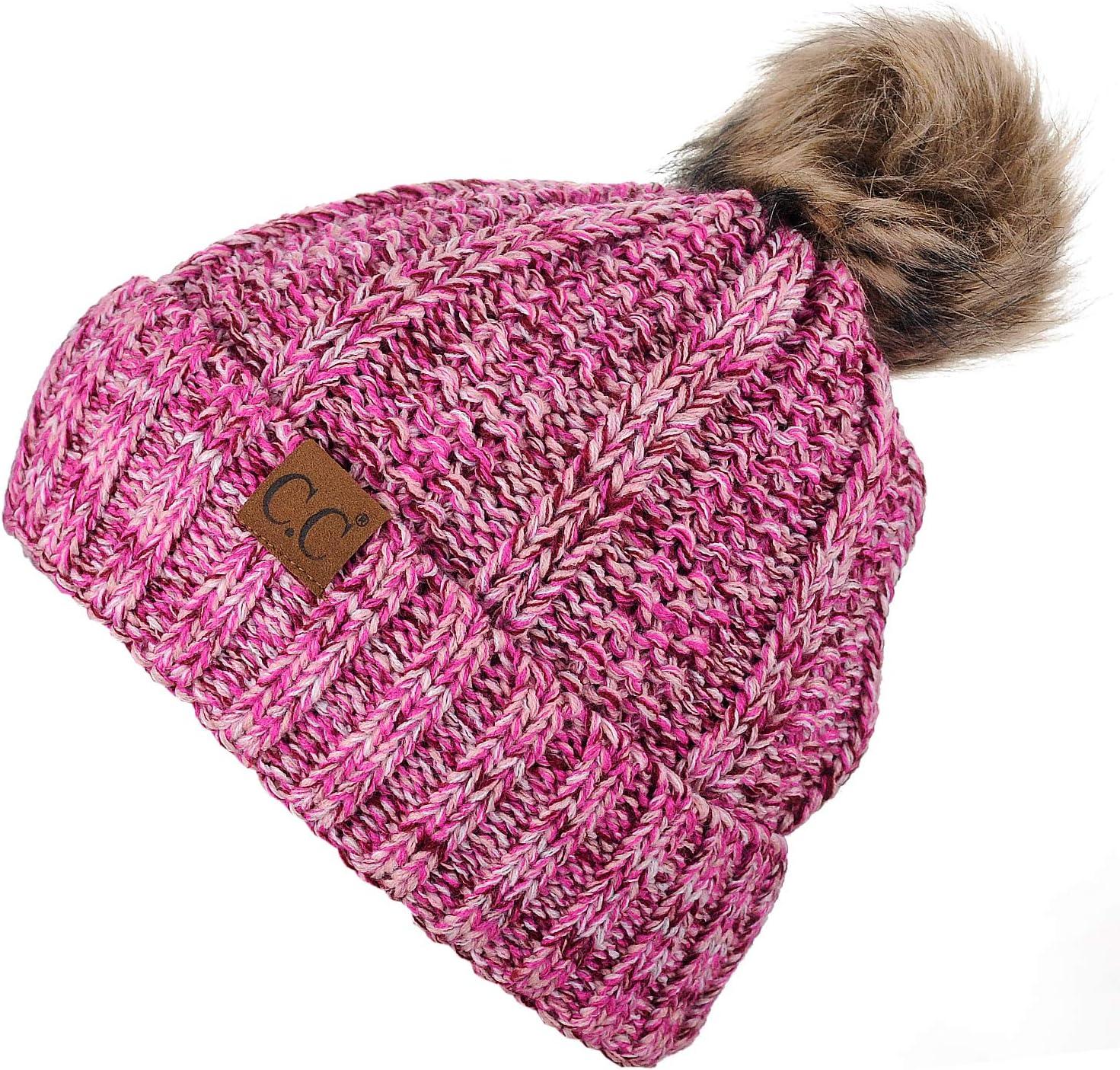 C.C Thick Cable Knit Faux Fuzzy Fur Pom Fleece Lined Skull Cap Cuff Beanie(3 Tone Pink)