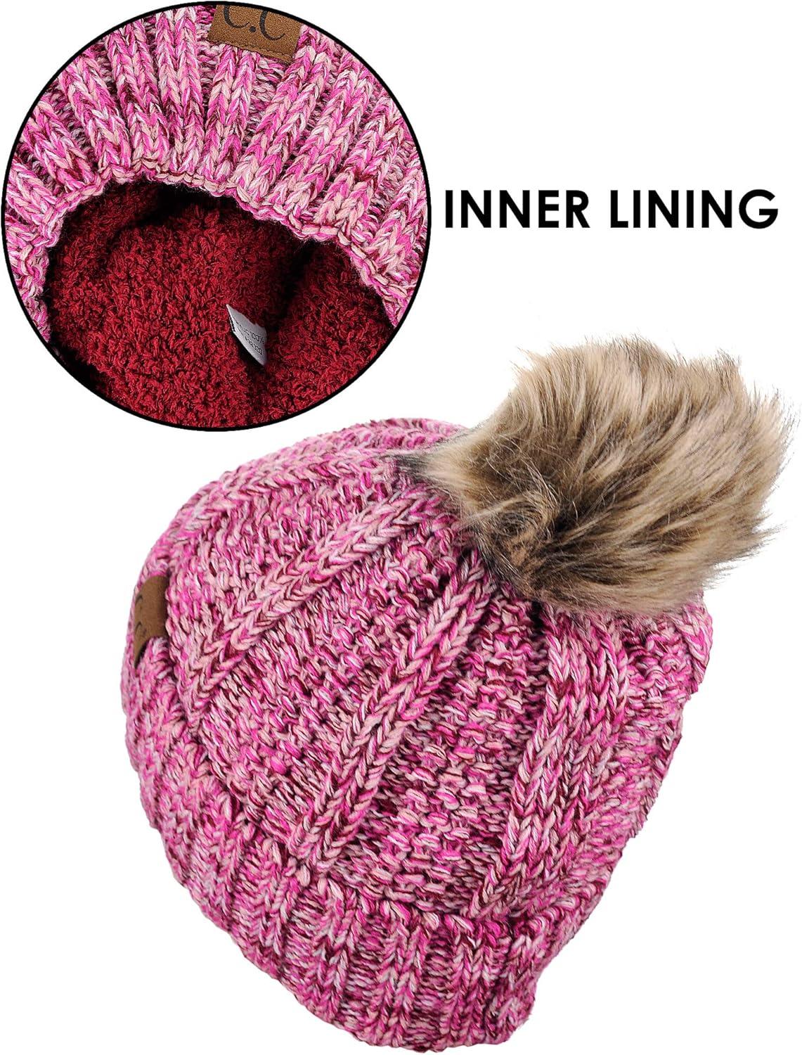 imageCC Thick Cable Knit Faux Fuzzy Fur Pom Fleece Lined Skull Cap Cuff Beanie3 Tone Pink