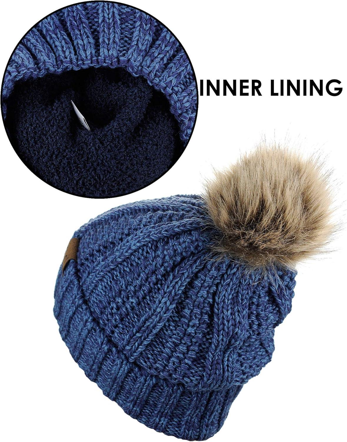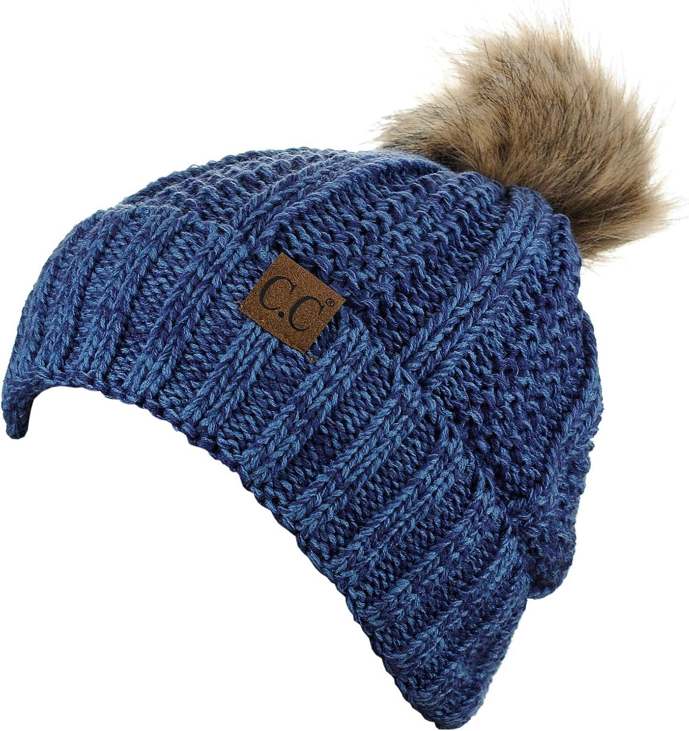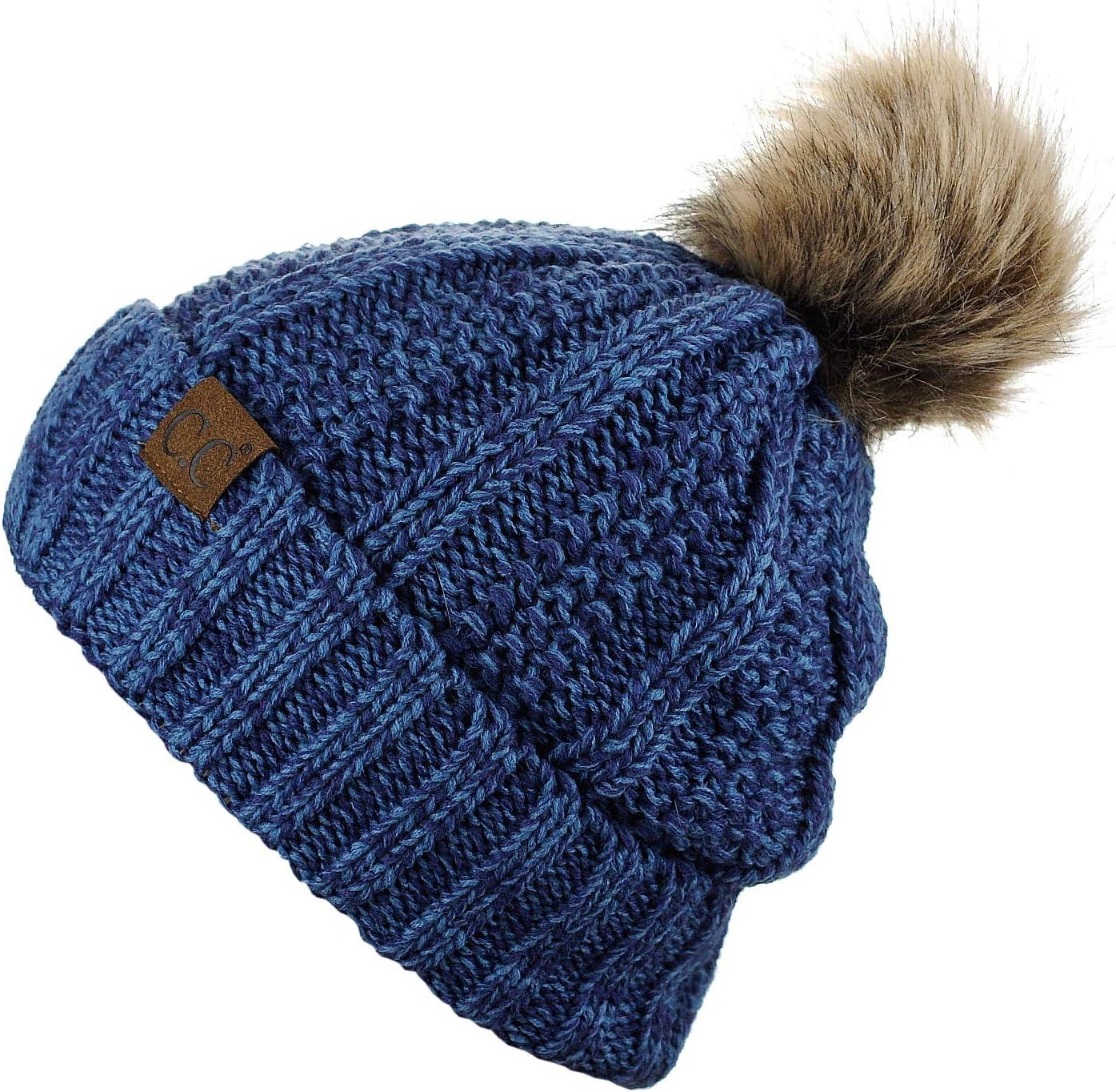 C.C Thick Cable Knit Faux Fuzzy Fur Pom Fleece Lined Skull Cap Cuff Beanie(Blue/Denim)