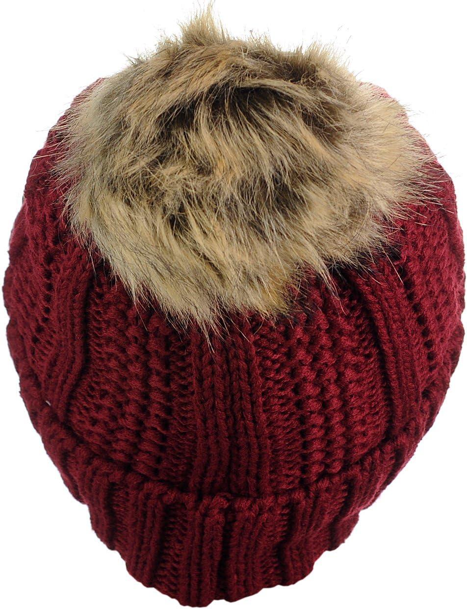 imageCC Thick Cable Knit Faux Fuzzy Fur Pom Fleece Lined Skull Cap Cuff BeanieBurgundy
