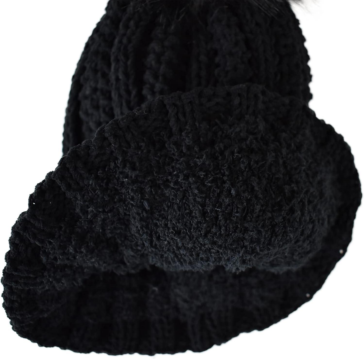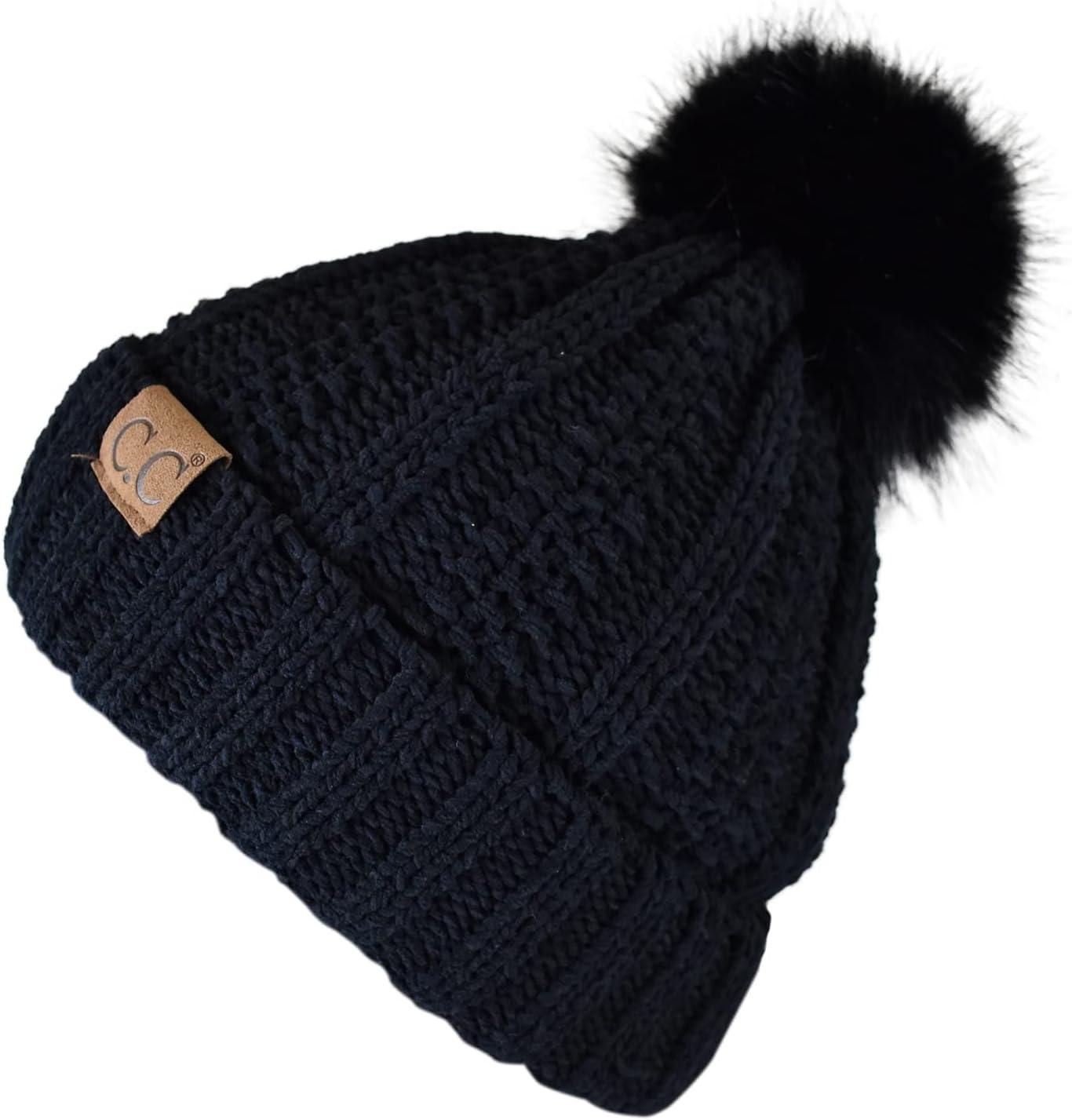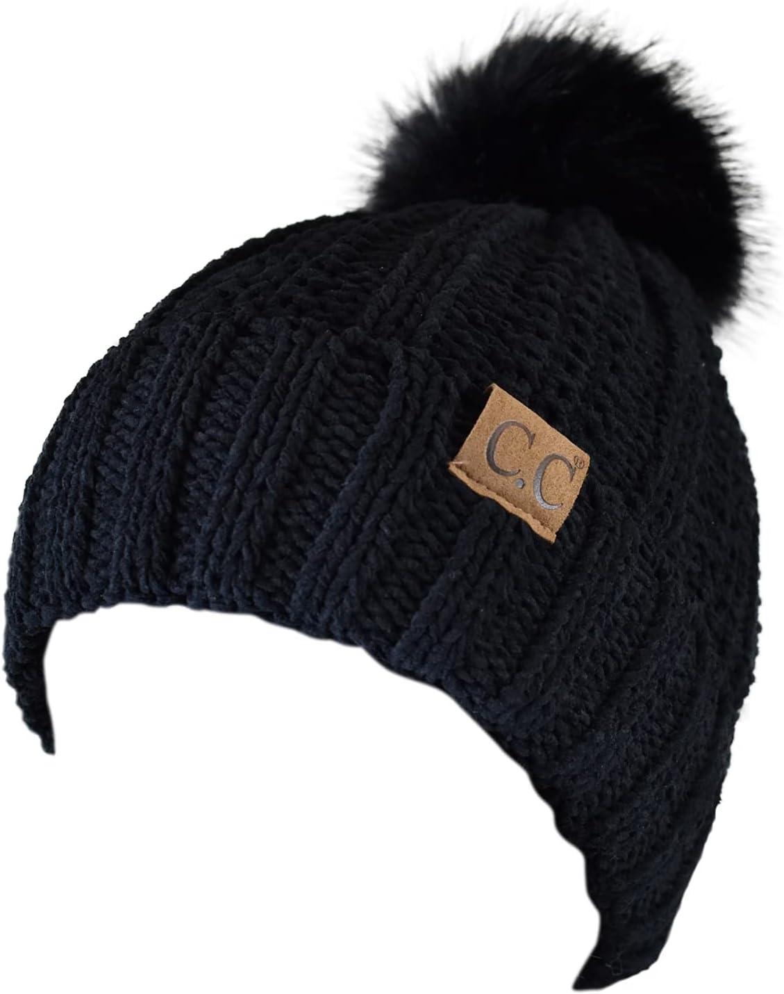 C.C Thick Cable Knit Faux Fuzzy Fur Pom Fleece Lined Skull Cap Cuff Beanie(Chenille Black Pom)