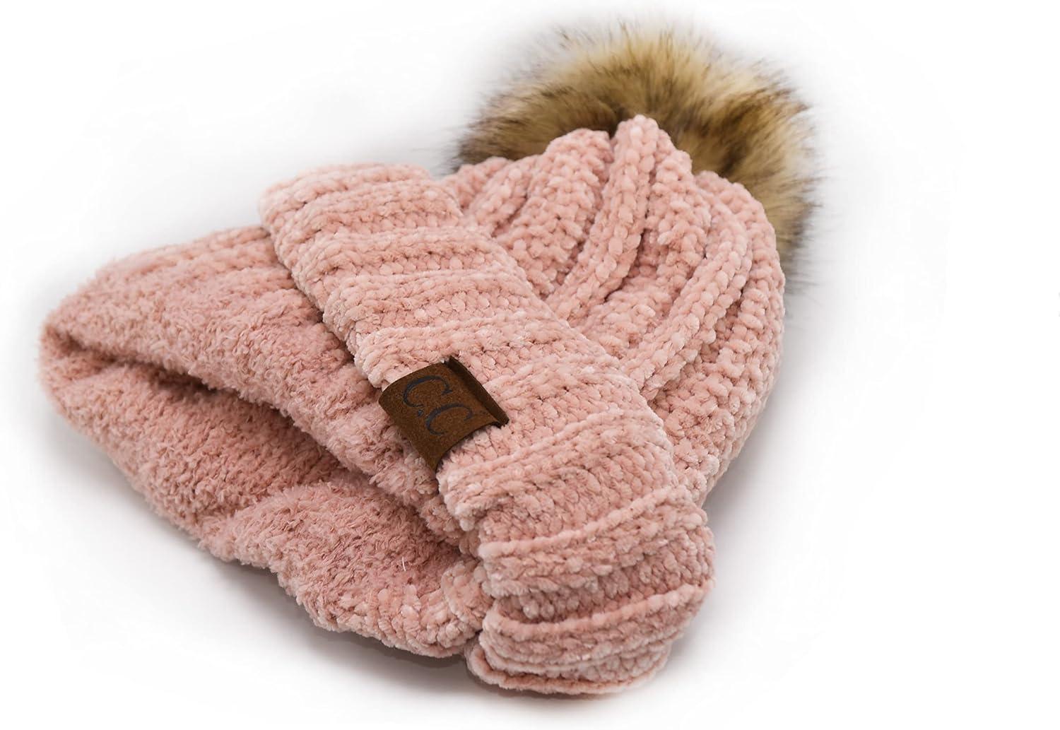 C.C Thick Cable Knit Faux Fuzzy Fur Pom Fleece Lined Skull Cap Cuff Beanie(Chenille Indi Pink)