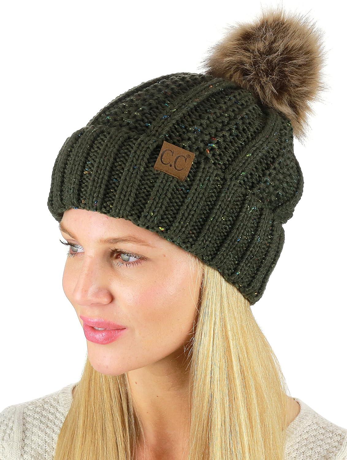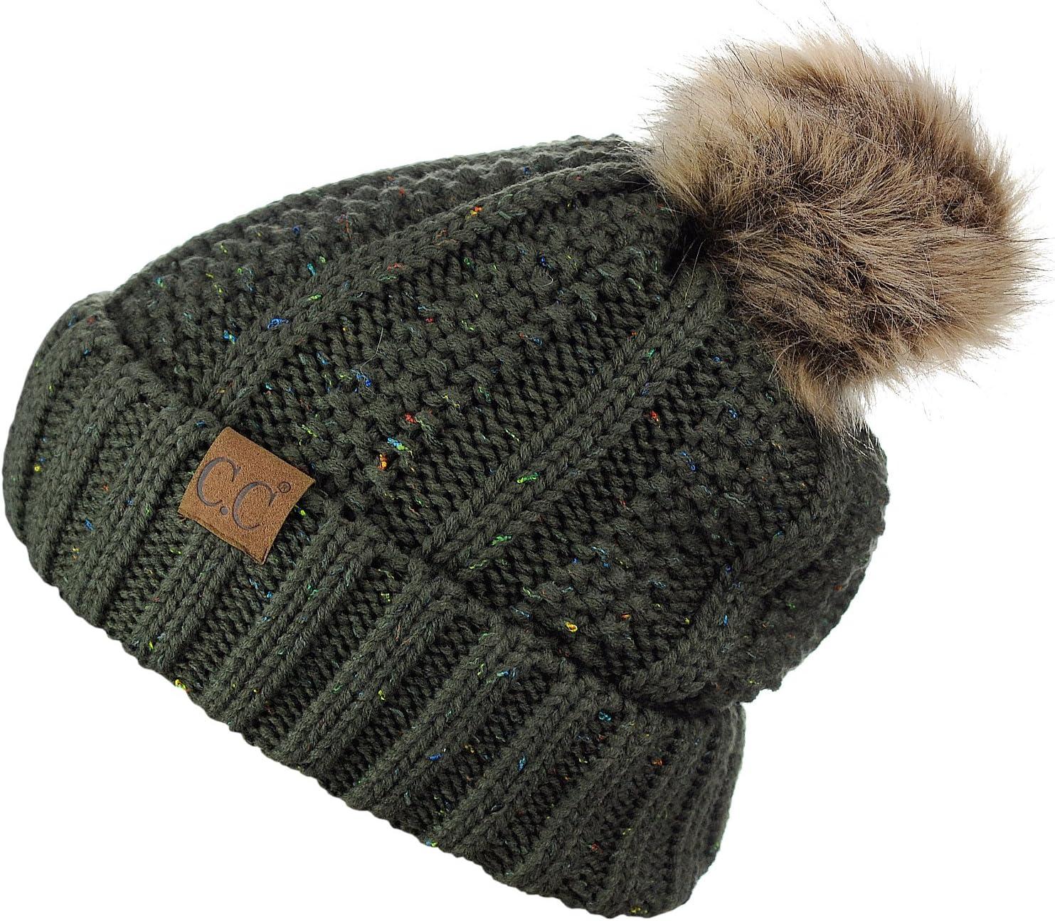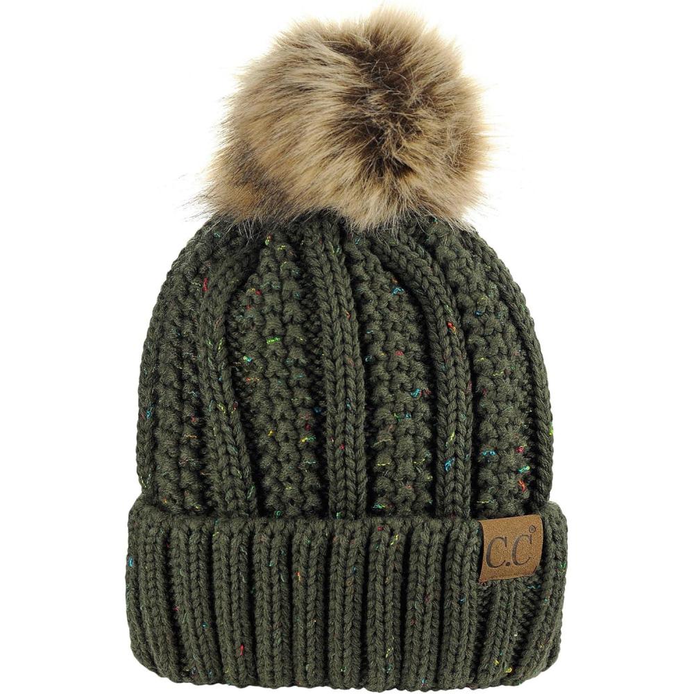 C.C Thick Cable Knit Faux Fuzzy Fur Pom Fleece Lined Skull Cap Cuff Beanie(Confetti Dark Olive)