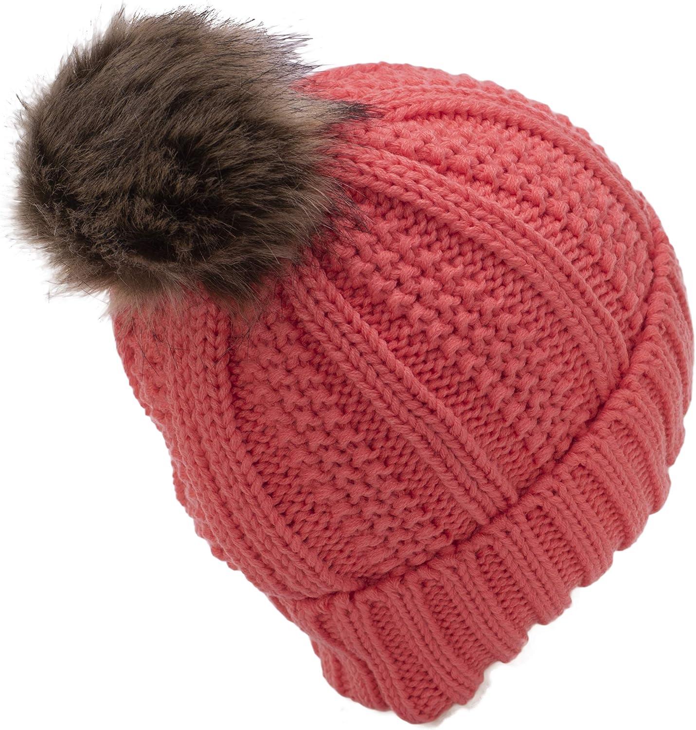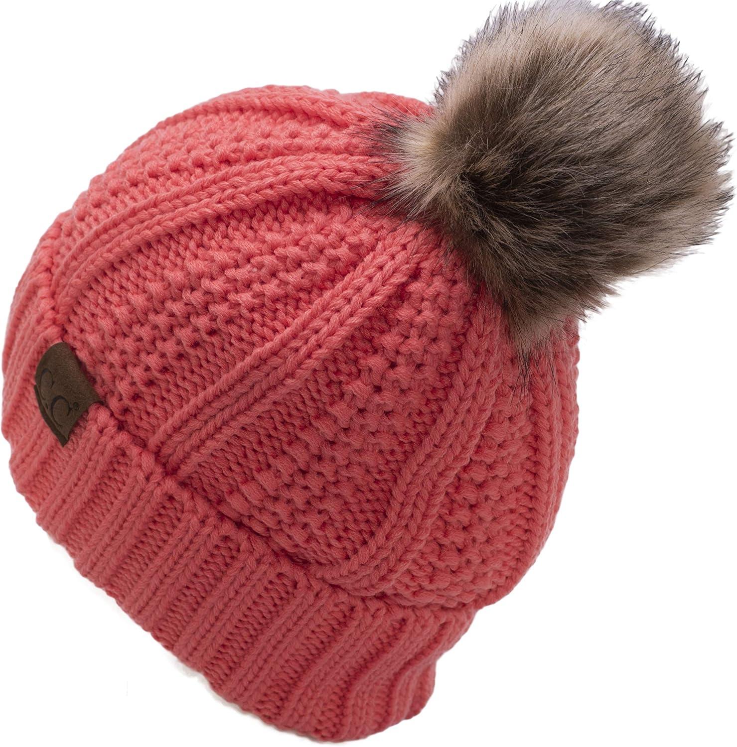 C.C Thick Cable Knit Faux Fuzzy Fur Pom Fleece Lined Skull Cap Cuff Beanie(Coral)