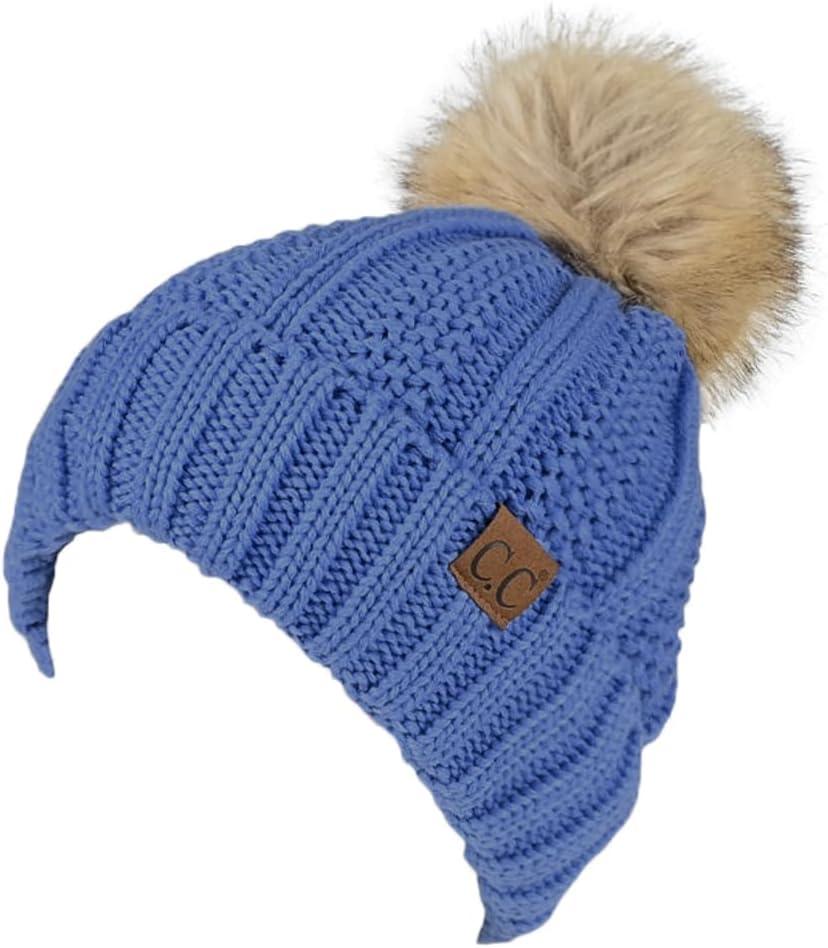 C.C Thick Cable Knit Faux Fuzzy Fur Pom Fleece Lined Skull Cap Cuff Beanie(Iris Blue)