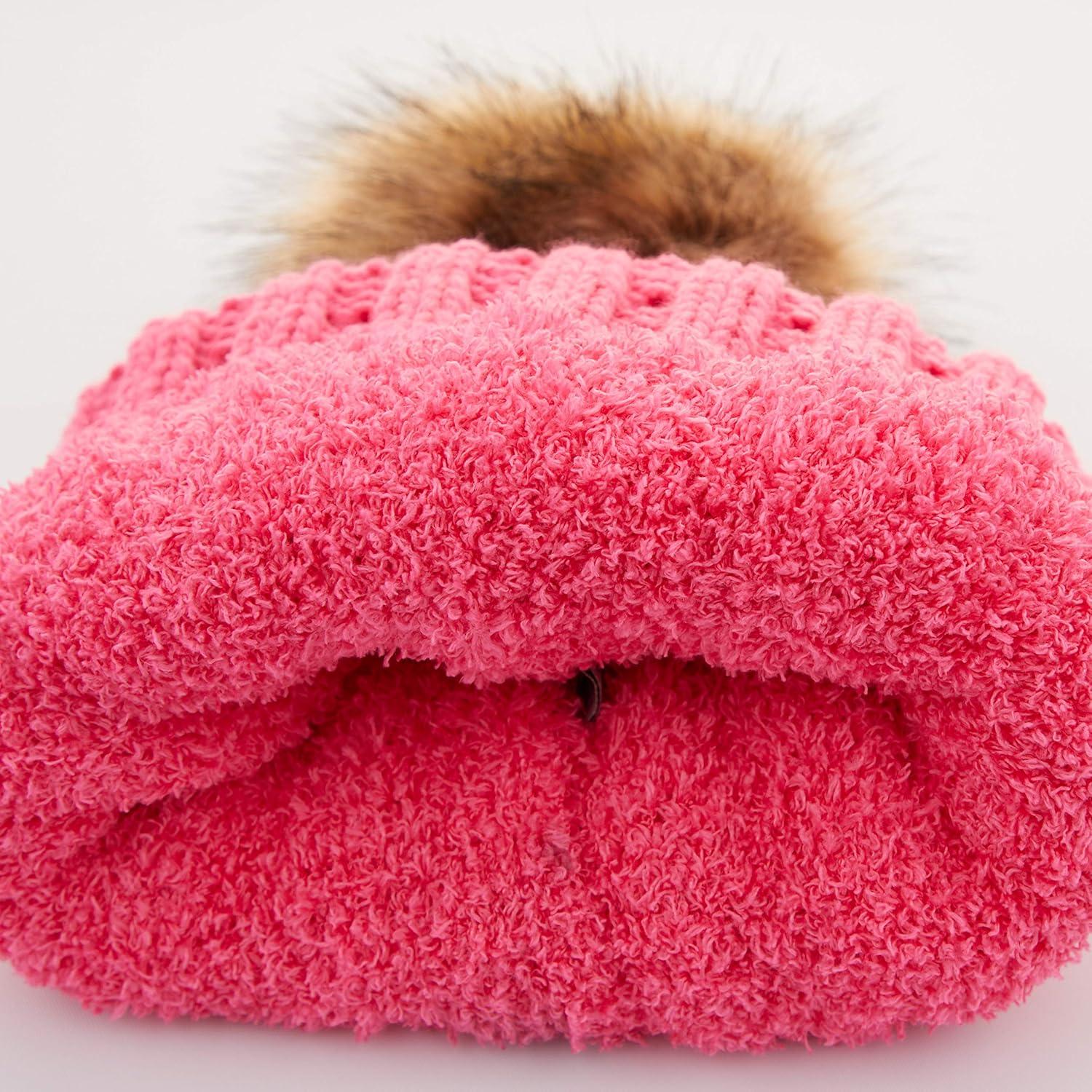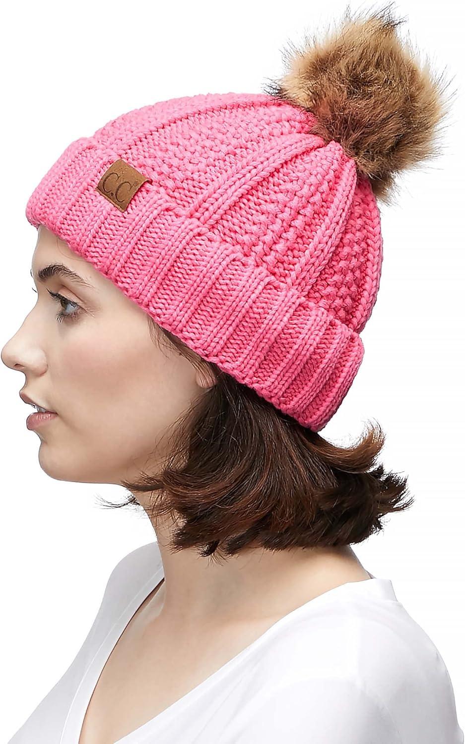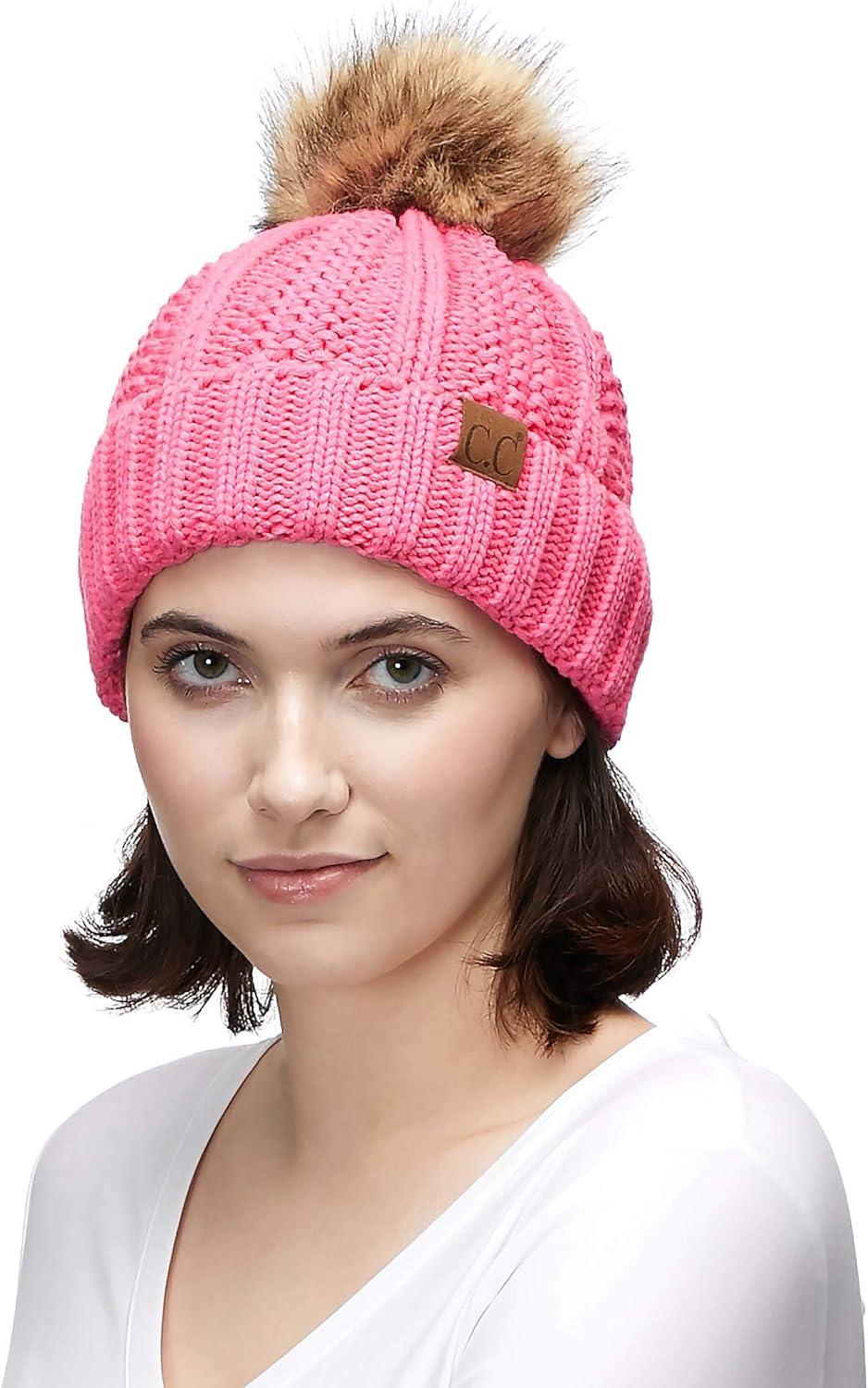imageCC Thick Cable Knit Faux Fuzzy Fur Pom Fleece Lined Skull Cap Cuff BeanieNew Candy Pink Amz