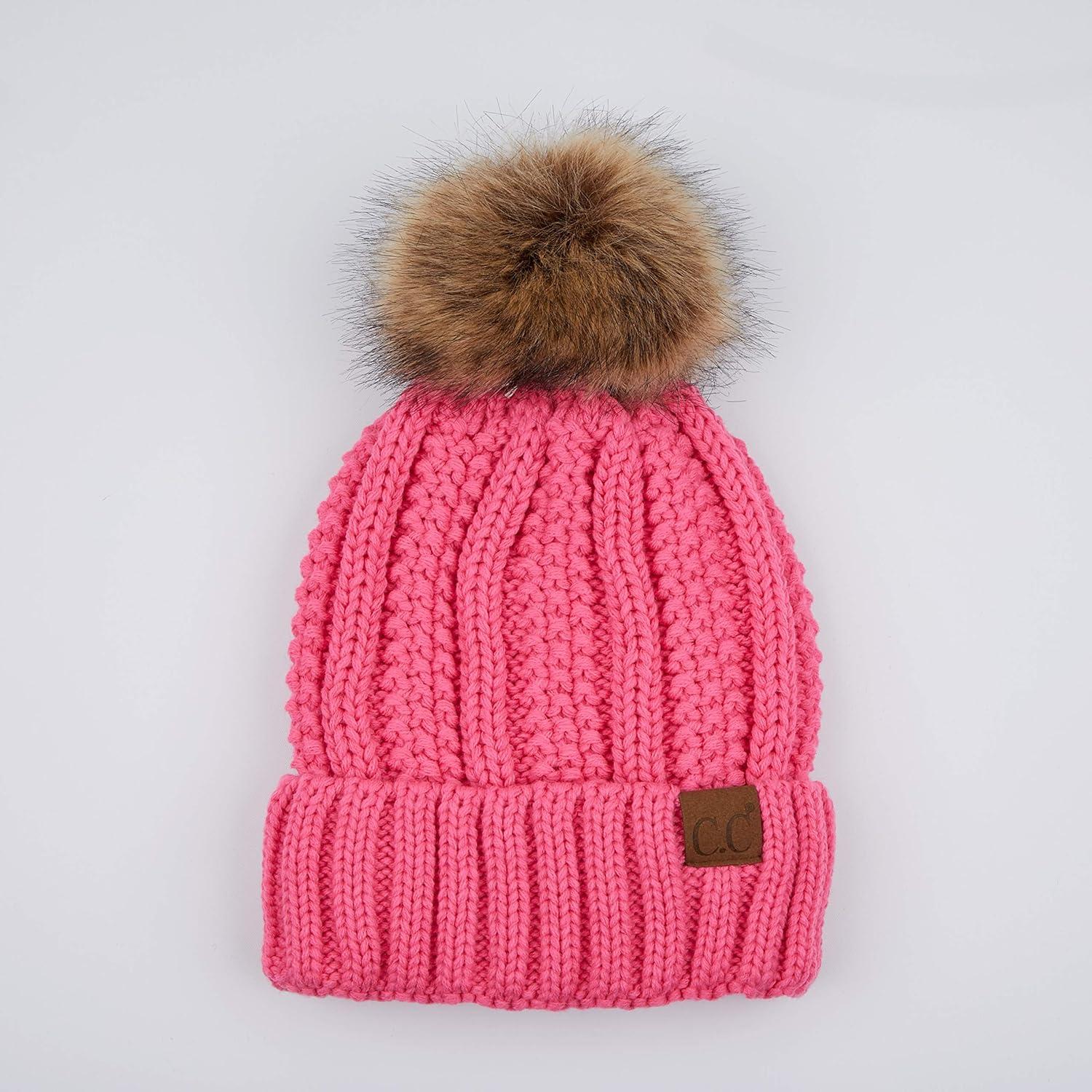 C.C Thick Cable Knit Faux Fuzzy Fur Pom Fleece Lined Skull Cap Cuff Beanie(New Candy Pink Amz)