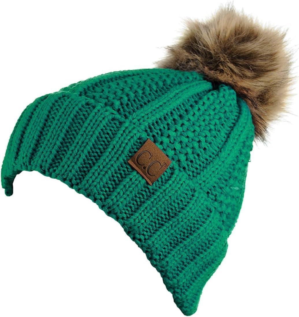 imageCC Thick Cable Knit Faux Fuzzy Fur Pom Fleece Lined Skull Cap Cuff BeanieSea Green