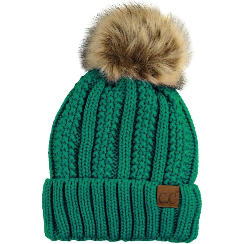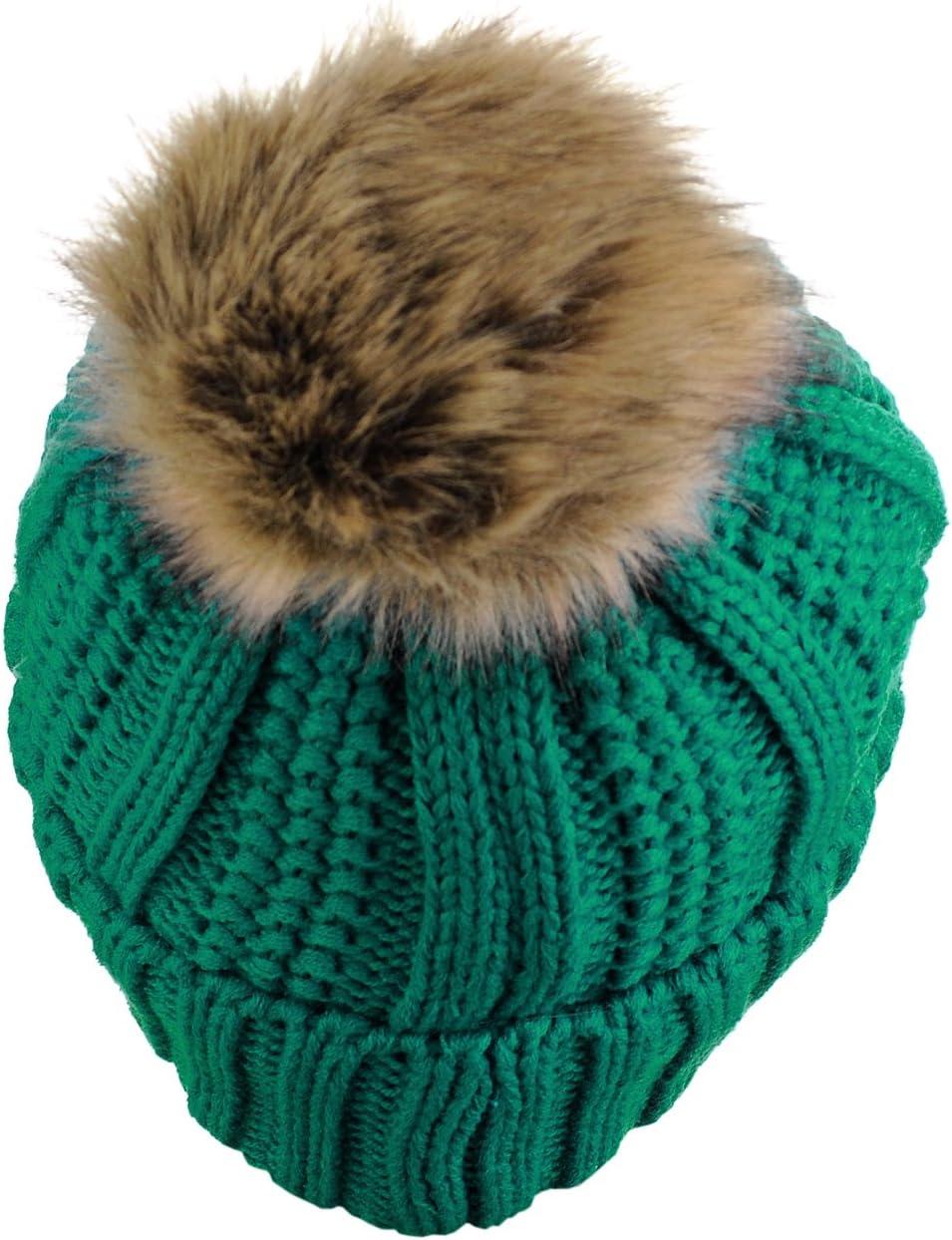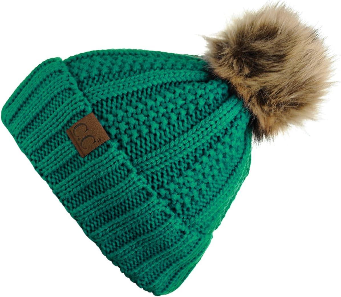 C.C Thick Cable Knit Faux Fuzzy Fur Pom Fleece Lined Skull Cap Cuff Beanie(Sea Green)