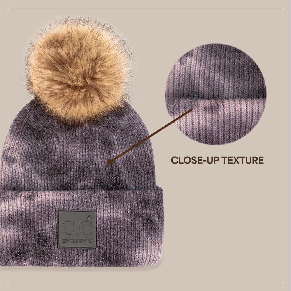 C.C Tie Dye Multi Color Knit Pom Beanie with Faux Fur Pom and Matching Scarf Set, Winter Accessories for Women(Fuchsia/Pink)