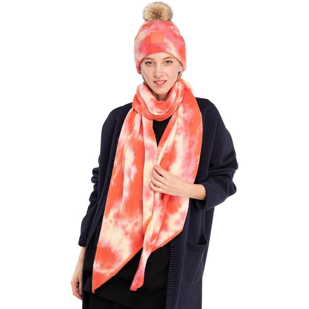 imageCC Tie Dye Multi Color Knit Pom Beanie with Faux Fur Pom and Matching Scarf Set Winter Accessories for WomenOrangePeach
