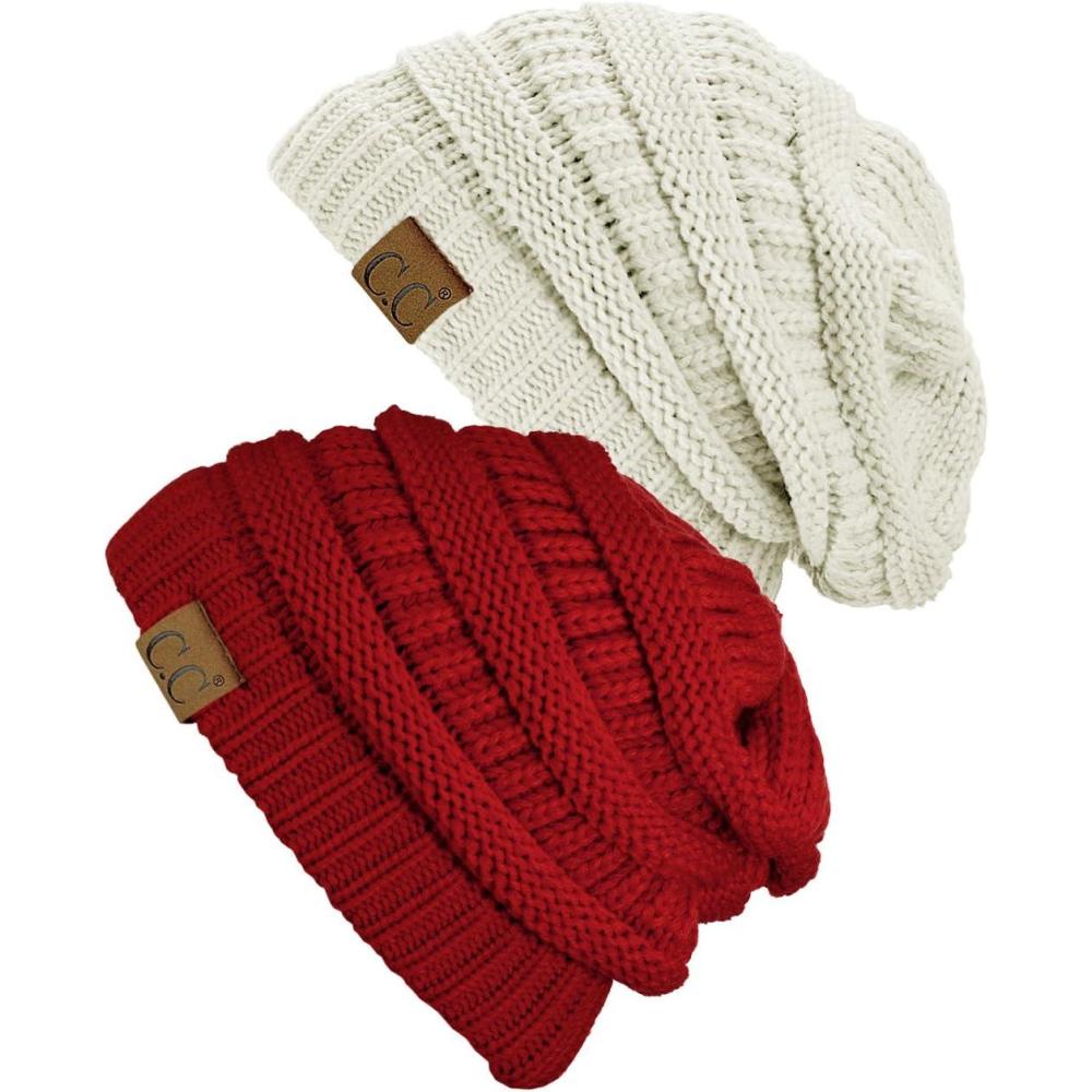 C.C Trendy Warm Chunky Soft Stretch Cable Knit Beanie Skully, 2 Pack(Ivory/Red)