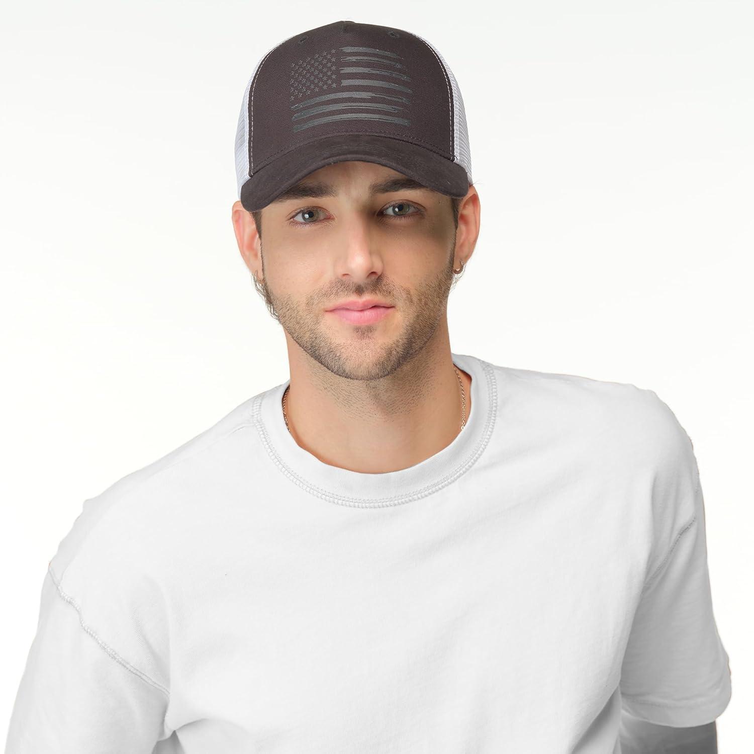 C.C Trucker Hat – American Flag Mesh Back Cap for Unisex, Adjustable Snapback, Laser Print Patriotic Baseball Cap(Grey Black)