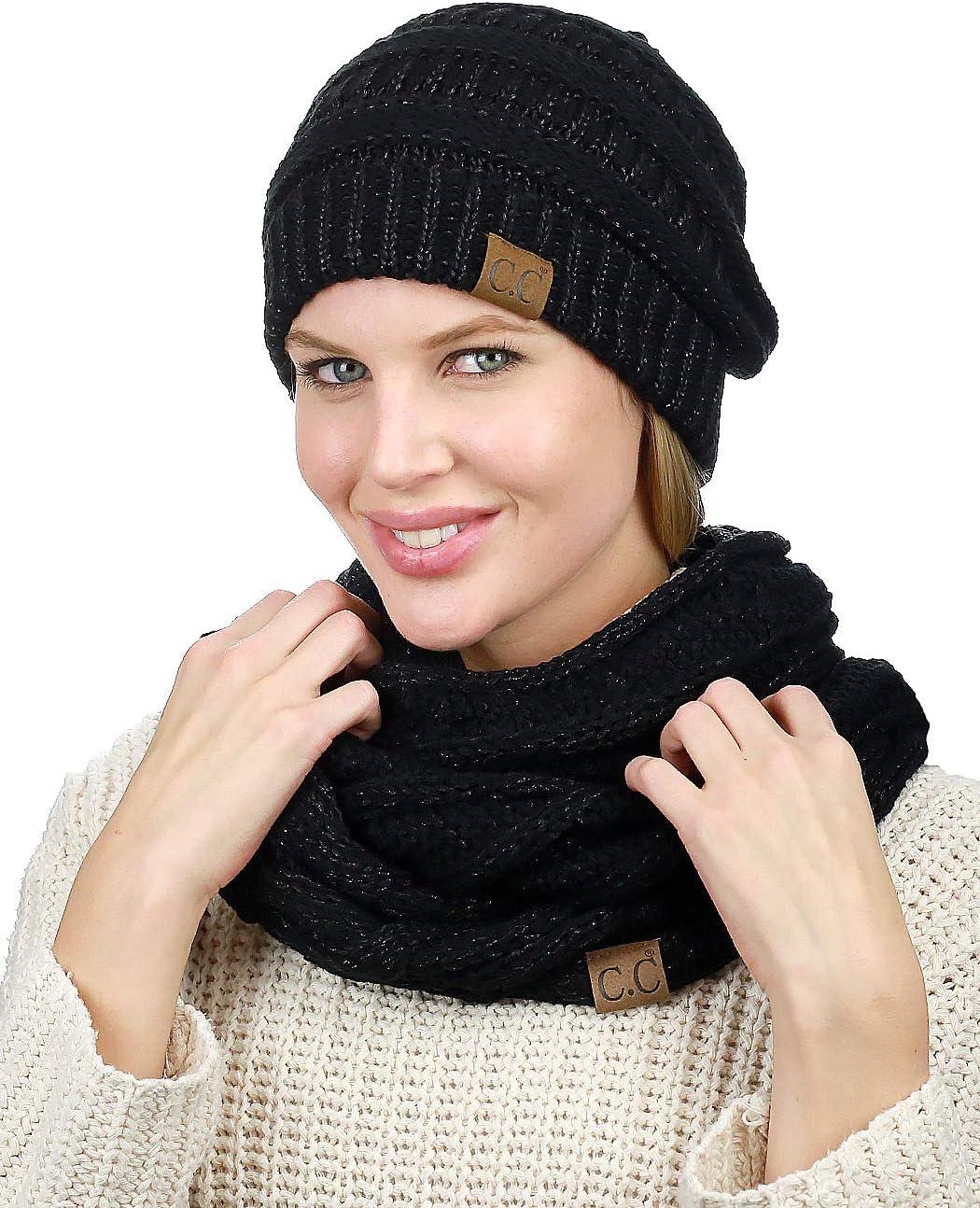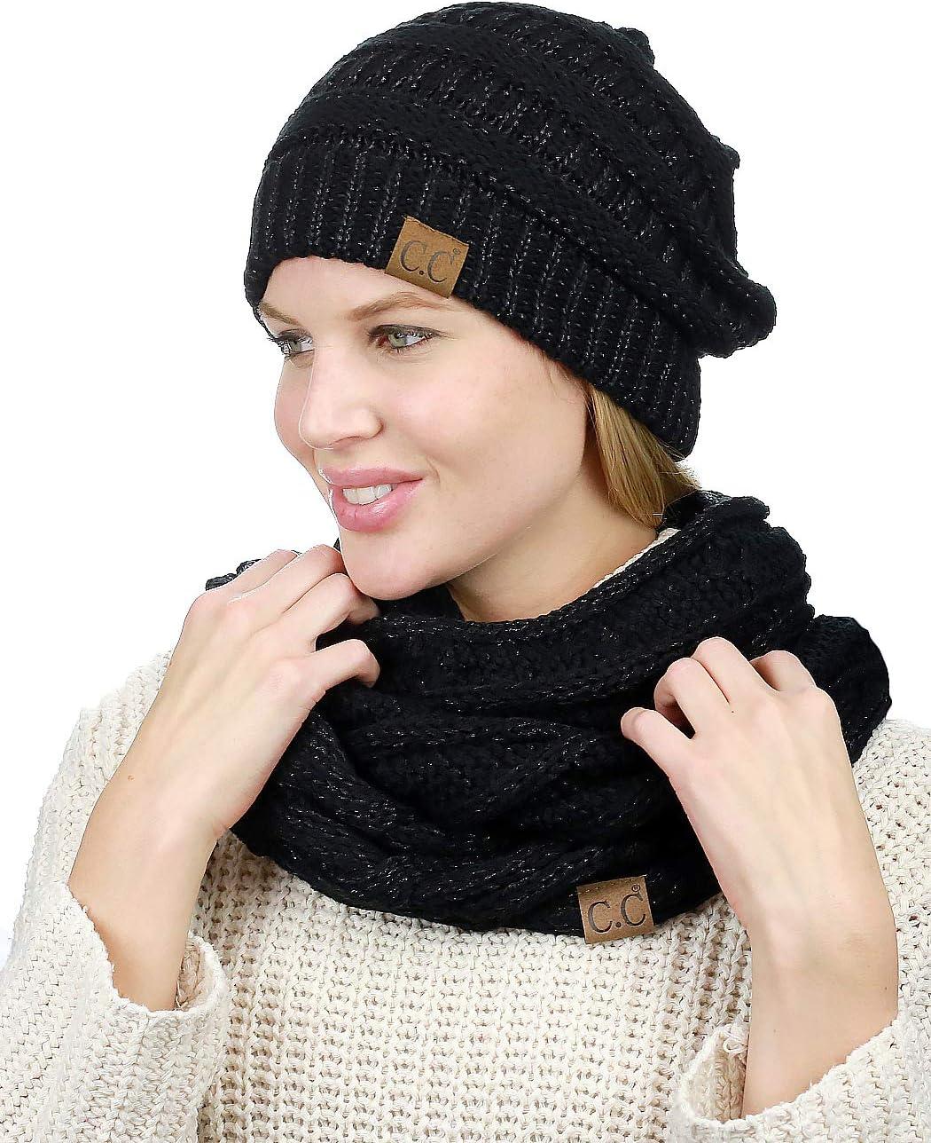 C.C Unisex Soft Stretch Chunky Cable Knit Beanie and Infinity Loop Scarf Set(Black Metallic)