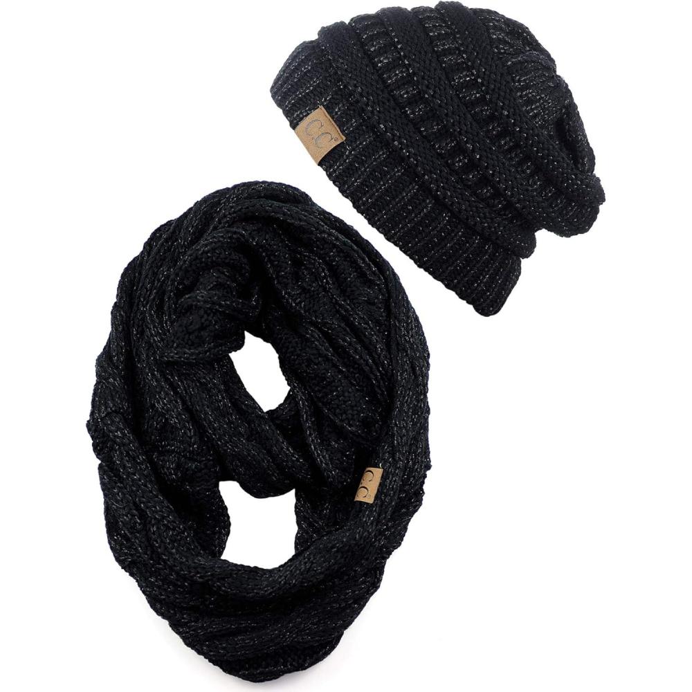 imageCC Unisex Soft Stretch Chunky Cable Knit Beanie and Infinity Loop Scarf SetBlack Metallic