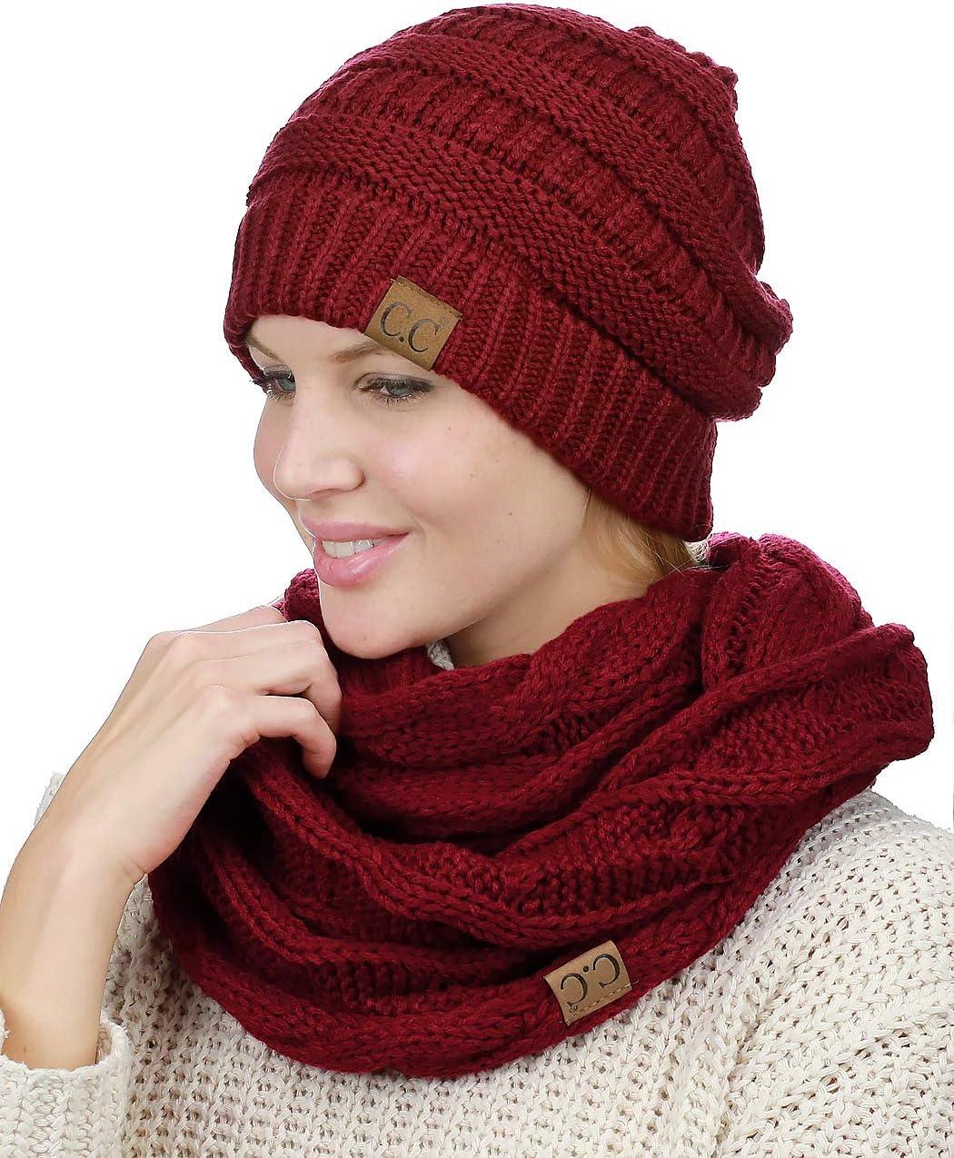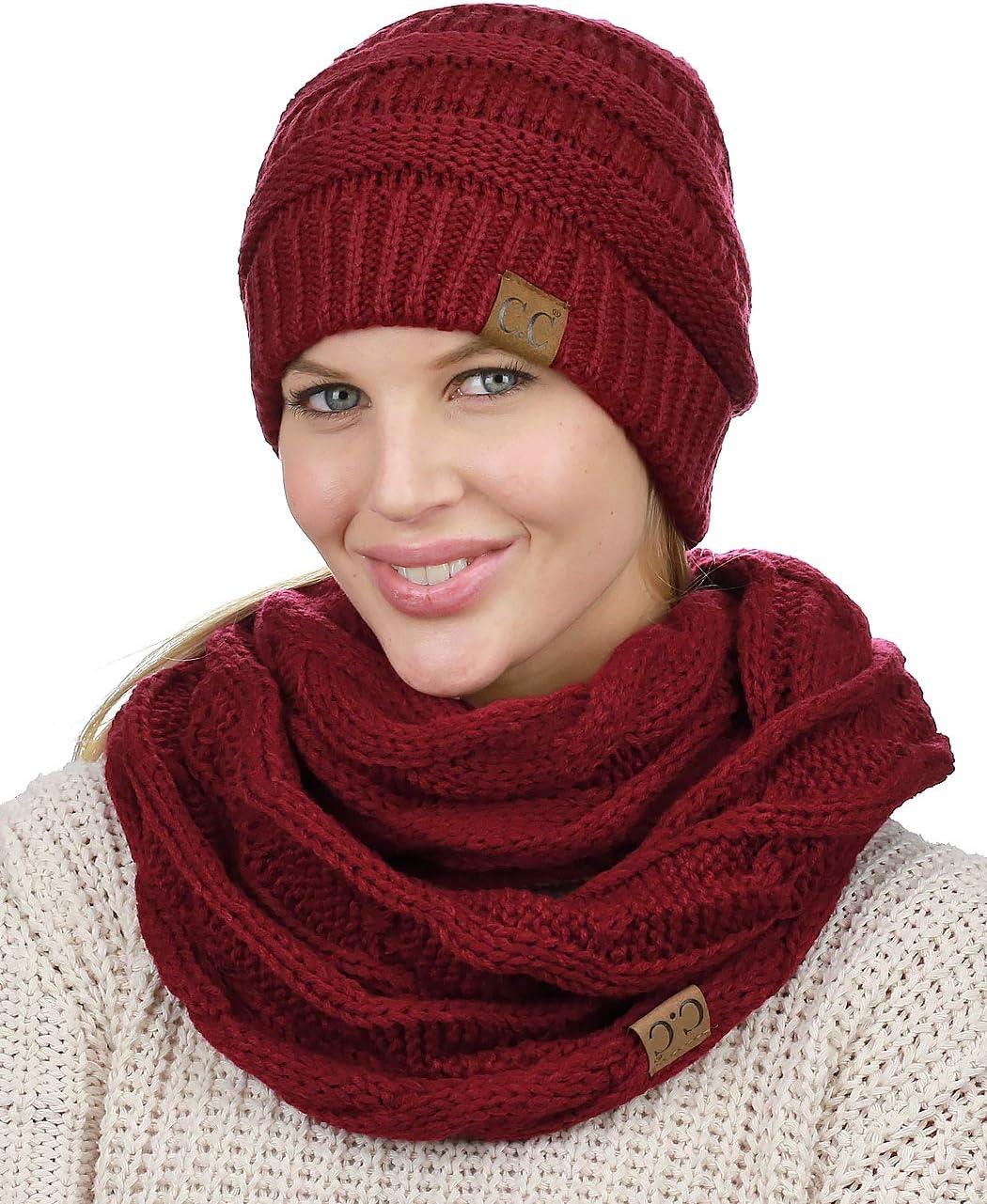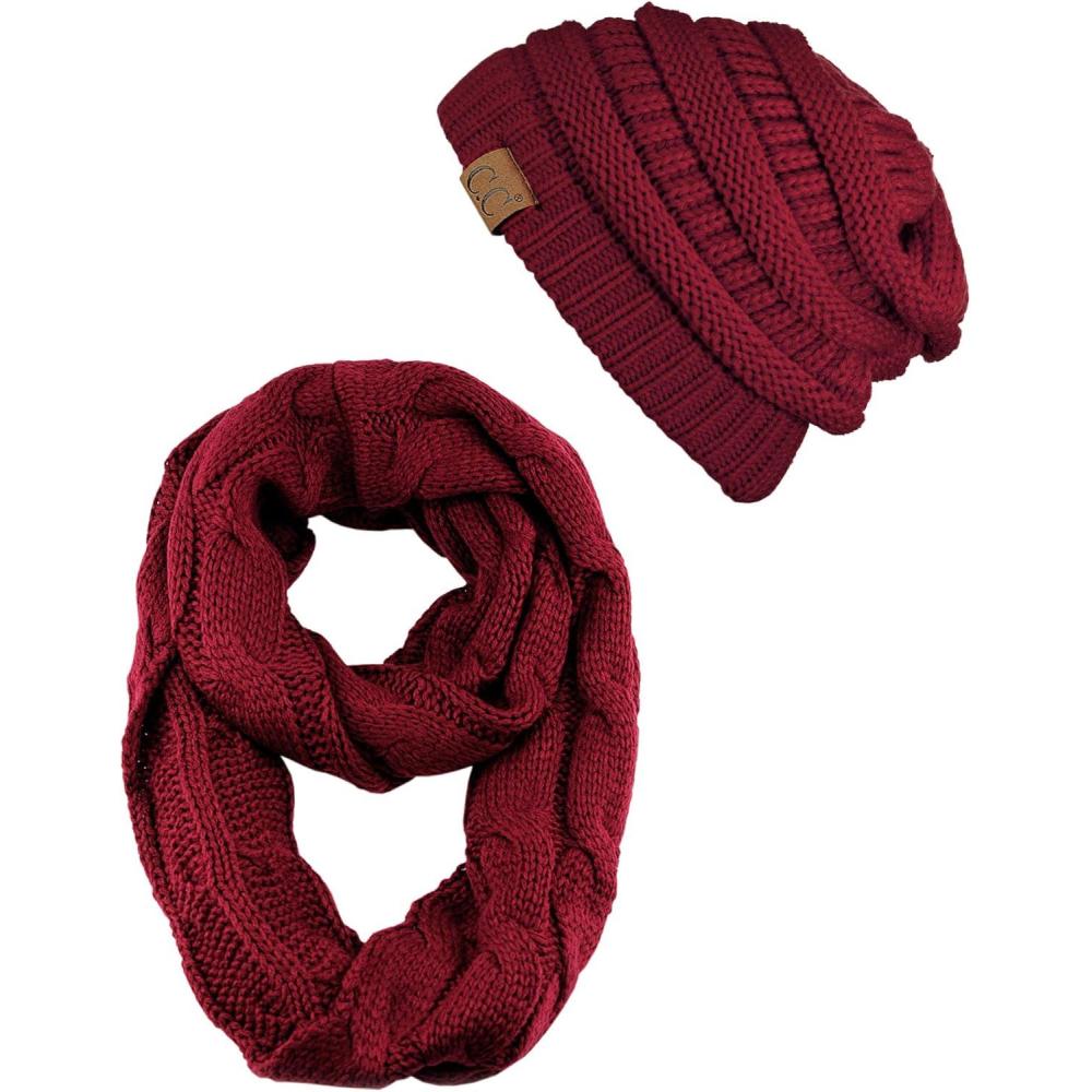 C.C Unisex Soft Stretch Chunky Cable Knit Beanie and Infinity Loop Scarf Set(Burgundy)