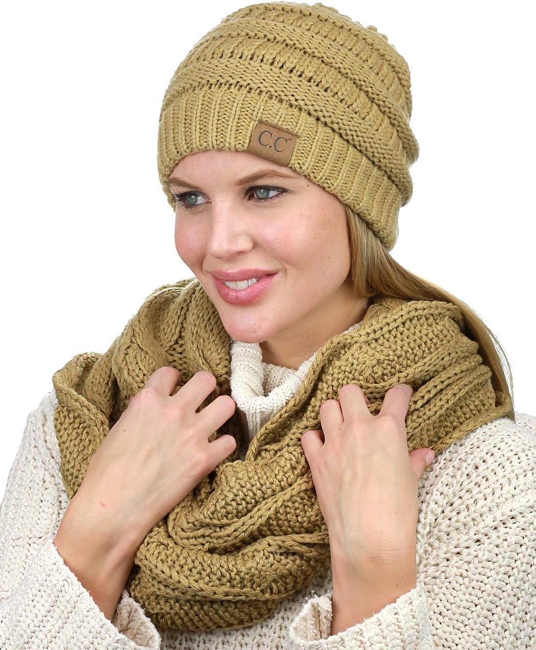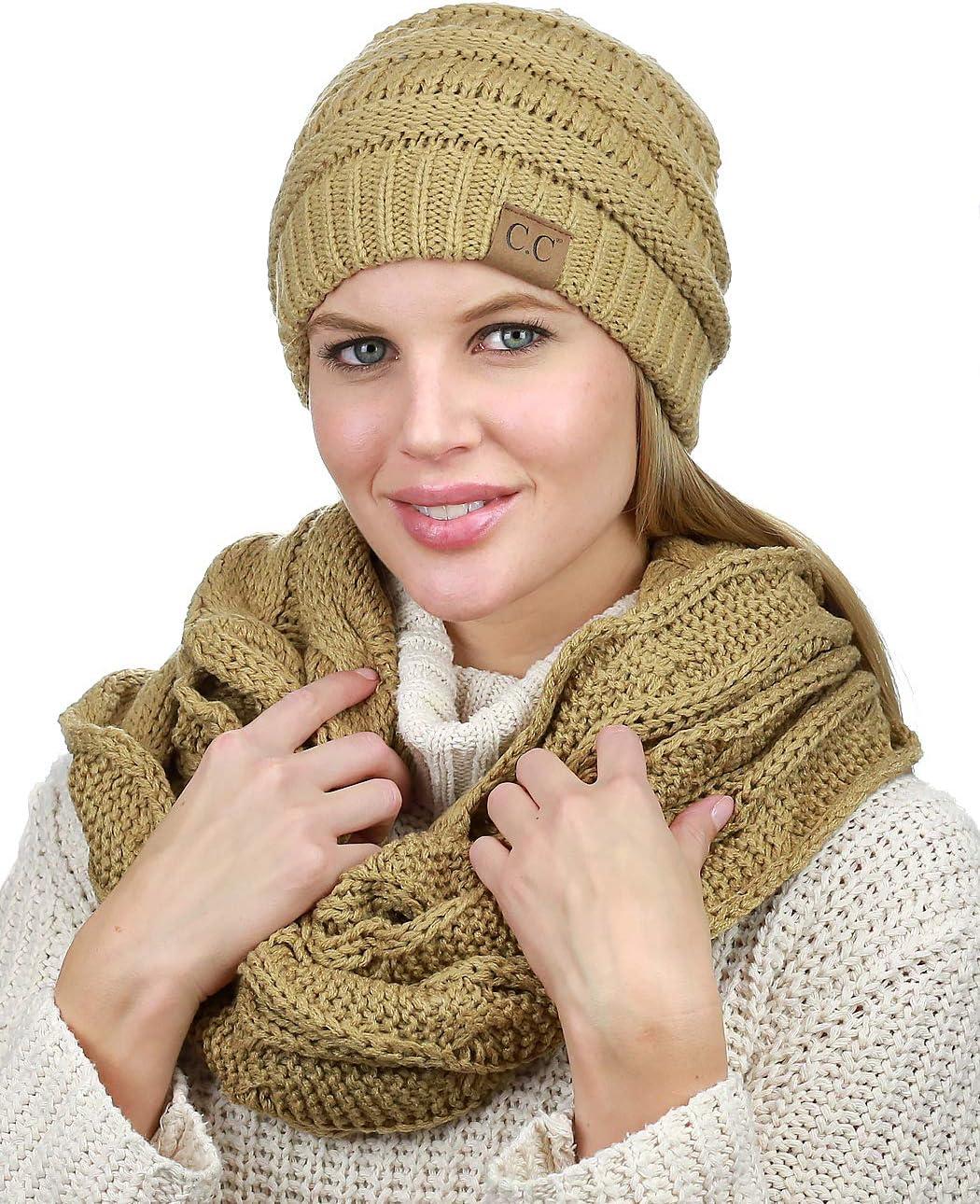 C.C Unisex Soft Stretch Chunky Cable Knit Beanie and Infinity Loop Scarf Set(Camel)