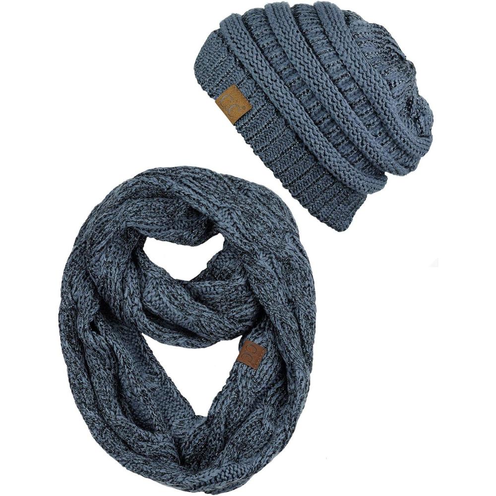 imageCC Unisex Soft Stretch Chunky Cable Knit Beanie and Infinity Loop Scarf SetDark Denim Metallic