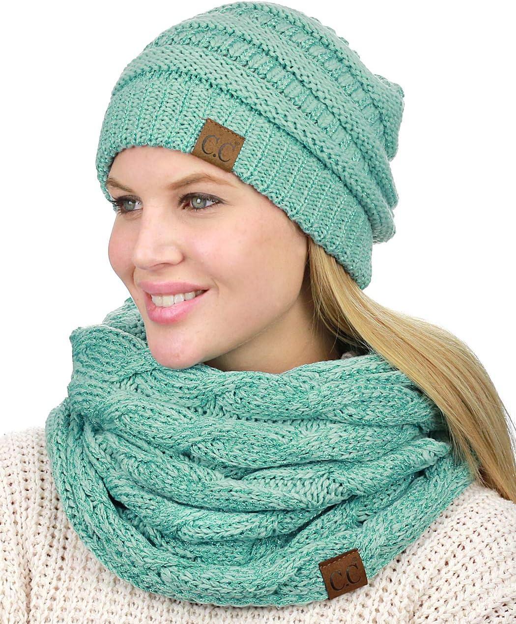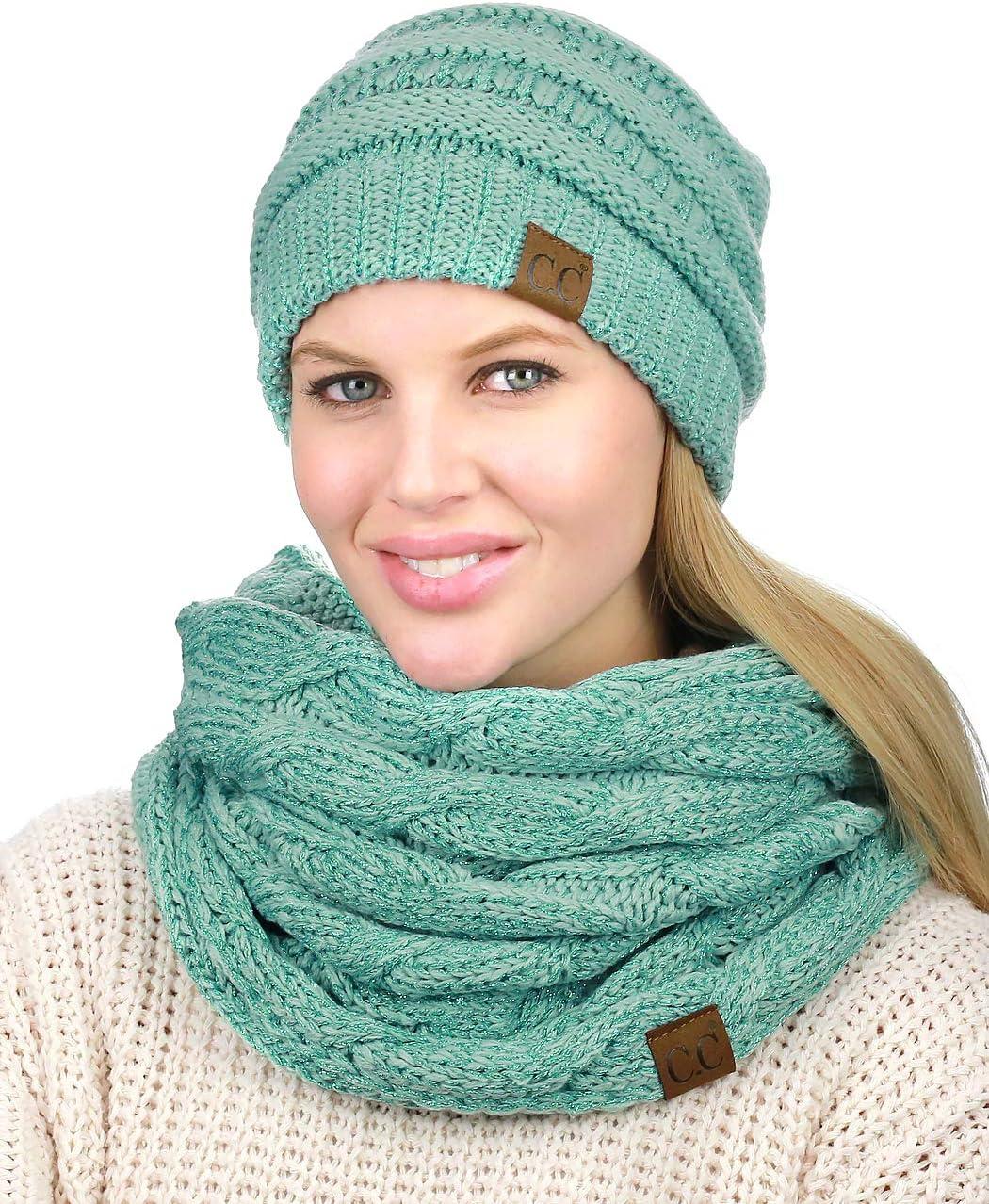 C.C Unisex Soft Stretch Chunky Cable Knit Beanie and Infinity Loop Scarf Set(Mint Metallic)